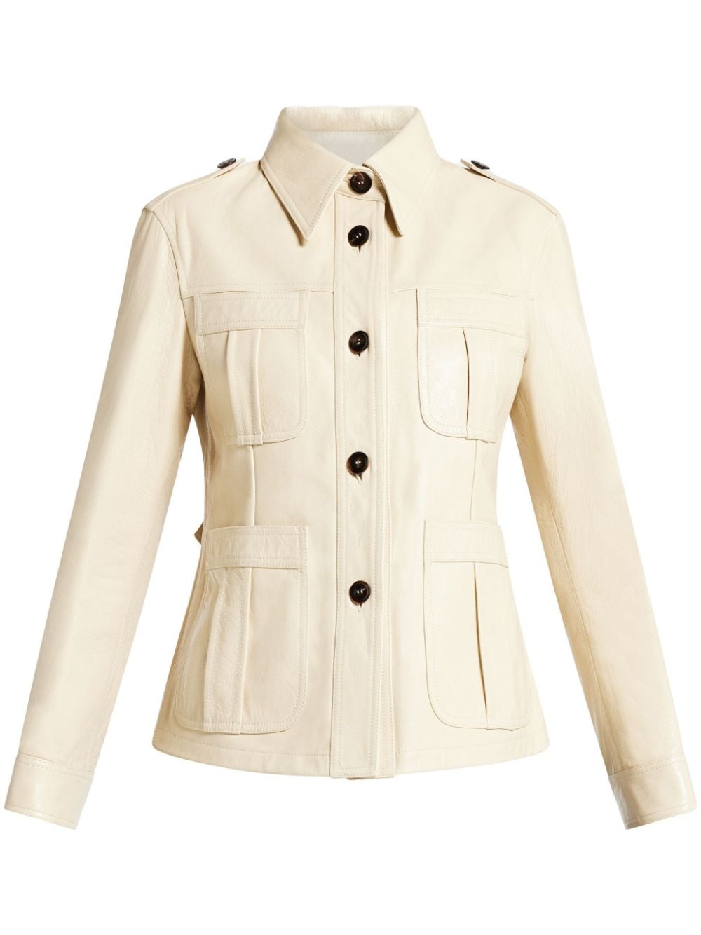 Field jacket Highlights - White - Goatskin - Grained texture - Front button fastening - Pointed flat collar - Epaulettes - Two chest patch pockets - Two front patch pockets - Dart detailing - Long sleeves - Buttoned cuffs - Straight hem Imported Composition Buffalo Horn 100%, Goat Skin 100% SIZE & FIT FittingInformation Designed for a relaxed fit, this piece allows for comfort and movement when worn Firm leather offering little flexibility to maintain its durability and sturdiness