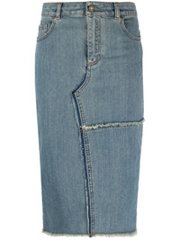 frayed pencil midi skirt Highlights - Ice blue - Stretch-cotton/cotton blend - Denim - Patchwork detailing - Frayed edge - Pencil silhouette - Mid-rise - Belt loops - Front button and zip fastening - Classic five pockets - Rear slit - Frayed hem - Mid-length Made in Italy Composition Outer: Cotton 98%, Elastane 2% Lining: Polyester 65%, Cotton 35% SIZE & FIT Model measurements Height 5 ft 10 in(1.77 m) Bust/Chest 31.1 in(79 cm) Hips 34.64 in(88 cm) Waist 24.8 in(63 cm) FittingInformation This mini-length skirt is intended to be worn just below the waist The vented hem offers movement at the rear Constructed from stretch denim, this piece offers a stretch fit with durability This piece fits true to size – take your usual size Measurement HIPS 32 in(81.3 cm) LENGTH 27 in(68.6 cm) WAIST 25.98 in(66 cm) Washing instructions Machine Wash
