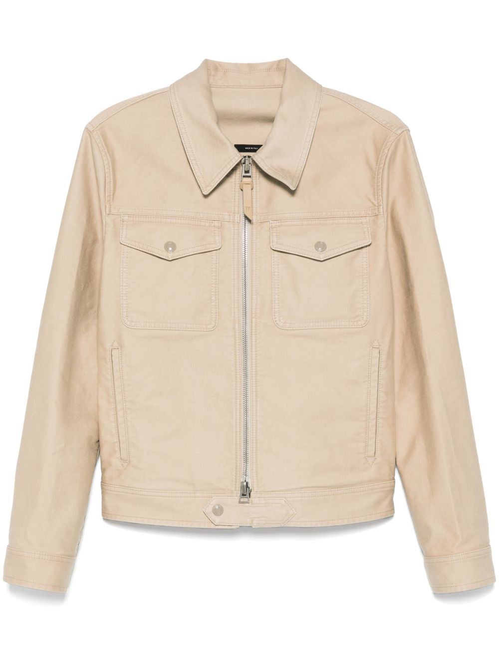 gabardine-weave jacket Highlights - Beige - Front zip fastening - Two chest flap pockets - Long sleeves - Two side welt pockets Made in Italy Composition Outer: Bos Taurus 100%, Cotton 100% Lining: Cotton 100% SIZE & FIT Model measurements Height 6 ft 2 in(1.87 m) Bust/Chest 38.18 in(97 cm) Hips 36.61 in(93 cm) Waist 29.13 in(74 cm) FittingInformation Designed for a slim fit, offering a comfortable fit that sits just away from the body The adjustable tabs allow for fitted preferences Made from a midweight non-stretch fabric