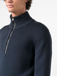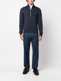 half-zip wool-silk jumper Highlights - Navy blue - Wool-silk blend - Ribbed knit - Stand-up collar - Half front zip fastening - Long sleeves - Ribbed cuffs and hem - Straight hem Made in Italy Composition Sheepskin 100%, Wool 70%, Silk 30% SIZE & FIT Model measurements Height 6 ft 2 in(1.88 m) Bust/Chest 37.79 in(96 cm) Hips 35.82 in(91 cm) Waist 29.92 in(76 cm) FittingInformation Designed for a relaxed fit, this piece allows for comfort and movement when worn Made from a midweight non-stretch fabric, this piece offers minimal elasticity when worn This piece fits true to size – take your usual size