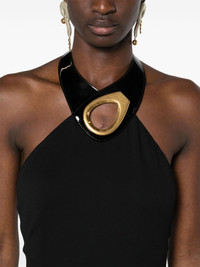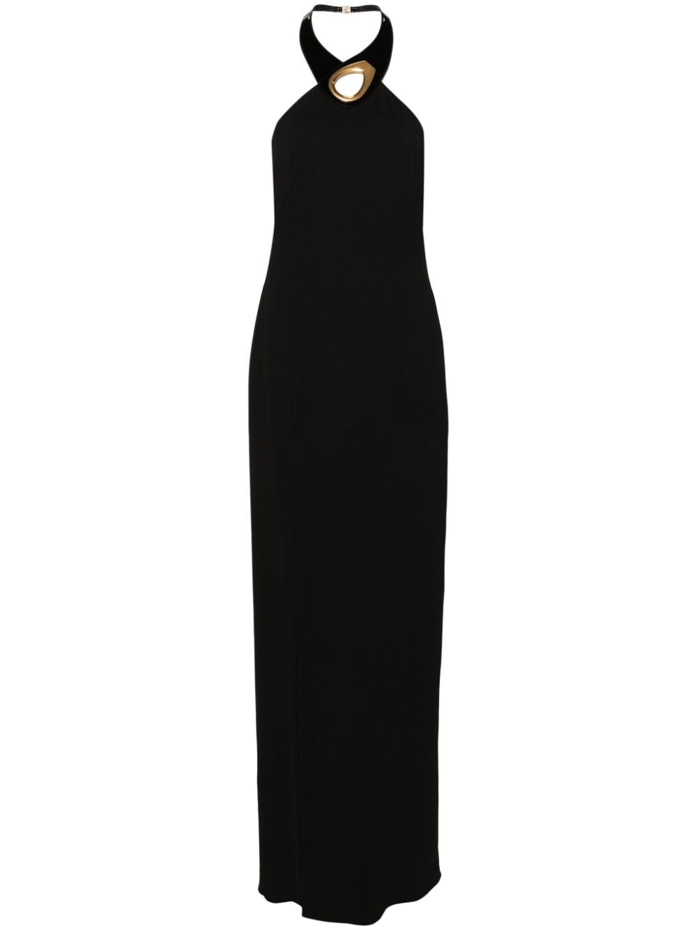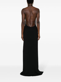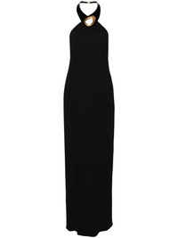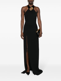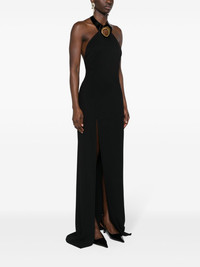 halterneck crepe gown Highlights - Black - Crepe texture - Gold-tone applique detail - Halterneck - Rubber grips - Concealed side zip fastening - Sleeveless - Open back - Side slit - Straight hem - Floor-length - Full lining Made in Italy Composition Viscose 97%, Elastane 3% SIZE & FIT Model measurements Height 5 ft 10 in(1.77 m) Bust/Chest 32.28 in(82 cm) Hips 35.03 in(89 cm) Waist 25.19 in(64 cm) FittingInformation Designed for a slim fit that sits just away from the body offering a close yet comfortable fit The vented hem offers movement at the rear Made from a midweight stretch fabric, this piece offers elasticity and flexibility when worn This piece fits true to size – take your usual size