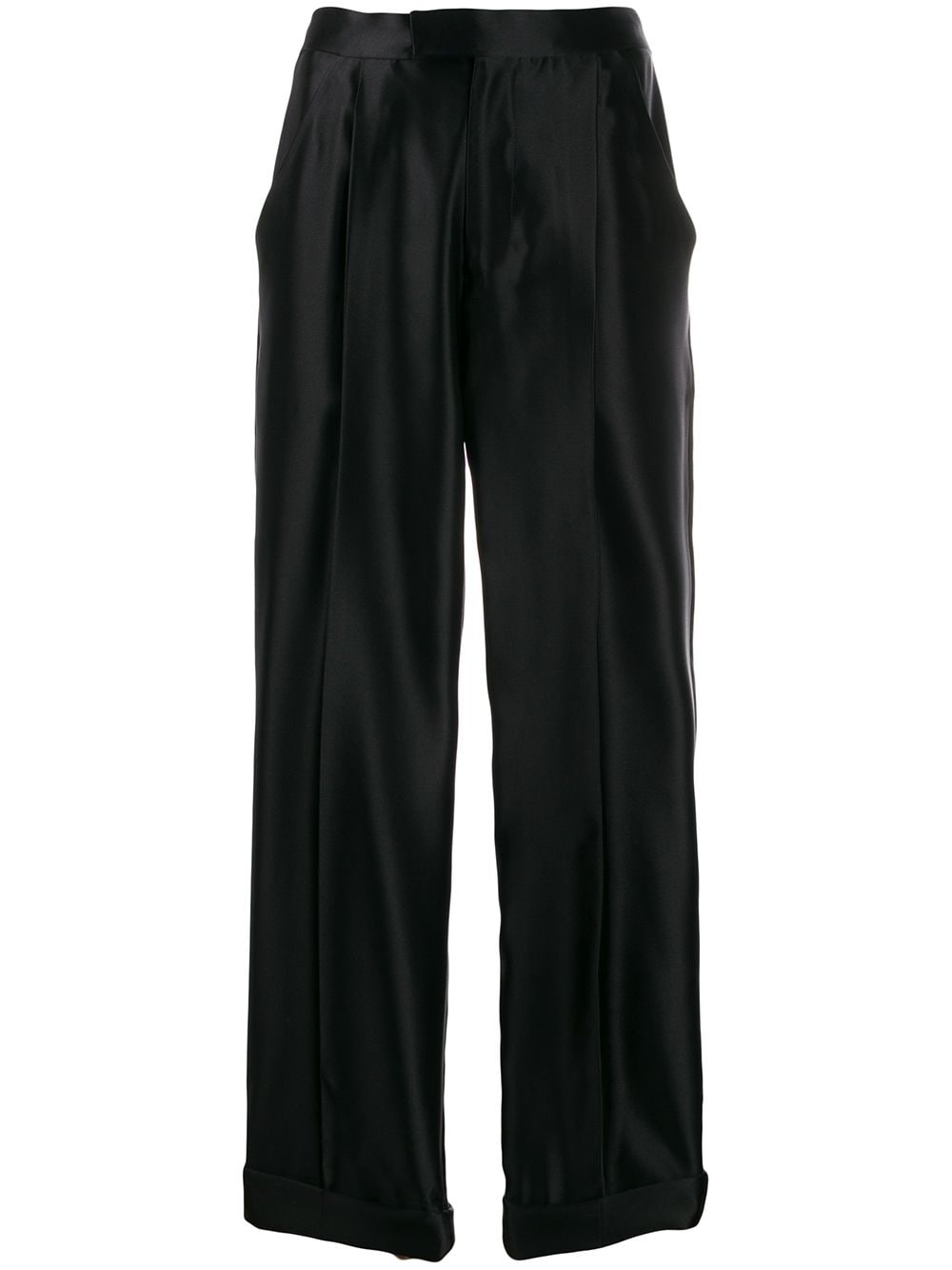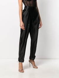 high-waisted silk trousers Highlights - Winter is coming, but tom ford has got you covered. from the aw19 collection, these black high waisted silk trousers feature a waistband, a high waist, a pleated waist, a straight leg and a regular length. Made in Italy Composition Outer: Silk 100%, Cotton 70%, Viscose 20%, Modal 10% Lining: Silk 90%, Spandex/Elastane 10% SIZE & FIT Model measurements Height 5 ft 9 in(1.74 m) Bust/Chest 32.28 in(82 cm) Hips 35.82 in(91 cm) Waist 24.01 in(61 cm) FittingInformation This piece fits true to size. We recommend you get your regular size Designed to be fitted at the waist, loose over the leg Made with a mid-weight stretch fabric Washing instructions Dry Clean Only