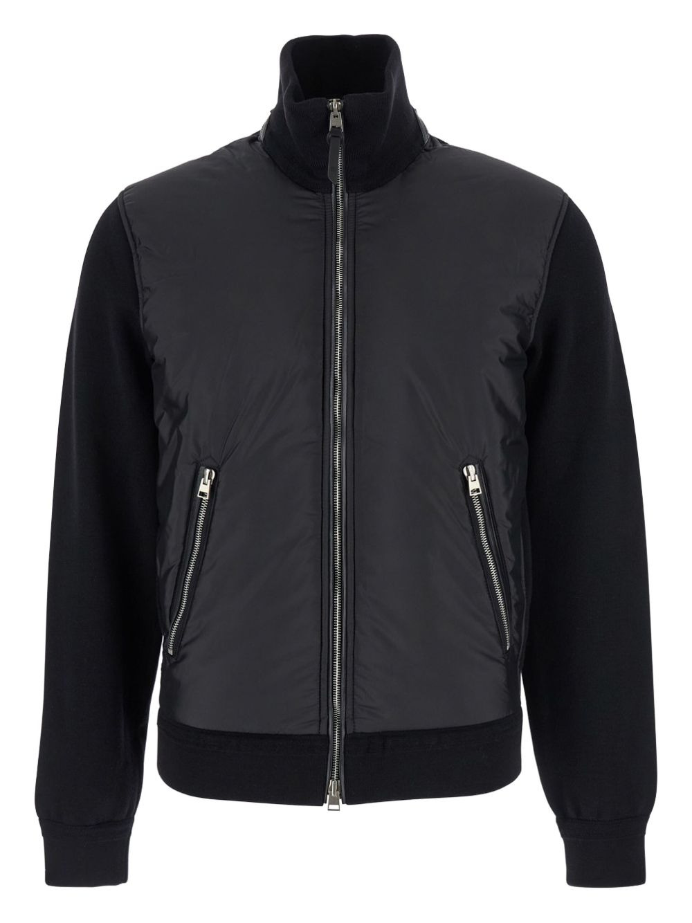 knitted paneled zip-front bomber jacket Highlights - Black - Wool-blend - Knitted panels - Zip front fastening - Welt zipped-pockets Imported Composition Virgin Wool 90%, Elastane 5%, Polyamide 5% Washing instructions Read Manufacturer Guidelines