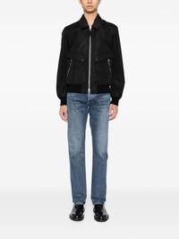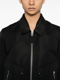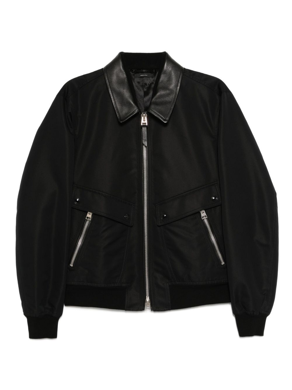 leather collar bomber Highlights - Black - Front zip fastening - Two side flap pockets - Two side zip-fastening pockets Made in Italy Composition Cotton 62%, Polyester 38% SIZE & FIT Model measurements Height 6 ft 2 in(1.87 m) Bust/Chest 31.49 in(80 cm) Hips 37.79 in(96 cm) Waist 27.95 in(71 cm) FittingInformation Designed for a boxy fit, intended for a loose fit throughout Made from a midweight non-stretch fabric Washing instructions Dry Clean Only
