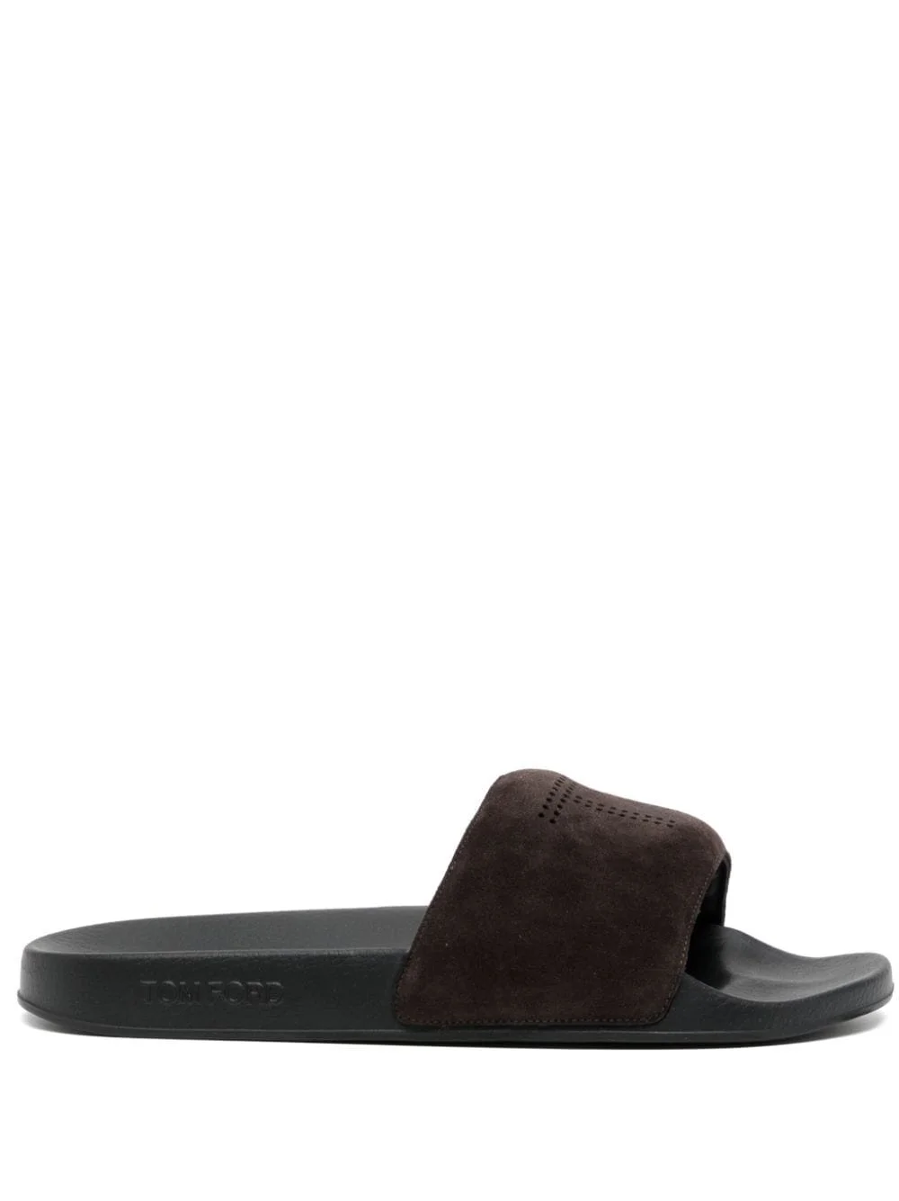 logo-perforated suede slides TOM FORD adopts a refined approach in these dark-brown slides. They boast a supple suede upper accented with a perforated logo and are finished with a moulded footbed. Highlights - Brown/black - Calf suede - Perforated logo detail - Logo at the sole - Single toe strap - Round open toe - Slip-on style - Flat leather sole Made in Italy Composition Outer: Calf Suede 100% Sole: Rubber 100% Lining: Polyester 100% SIZE & FIT Measurement HEEL 0.98 in(2.5 cm) Sole height 0.39 in(1 cm)