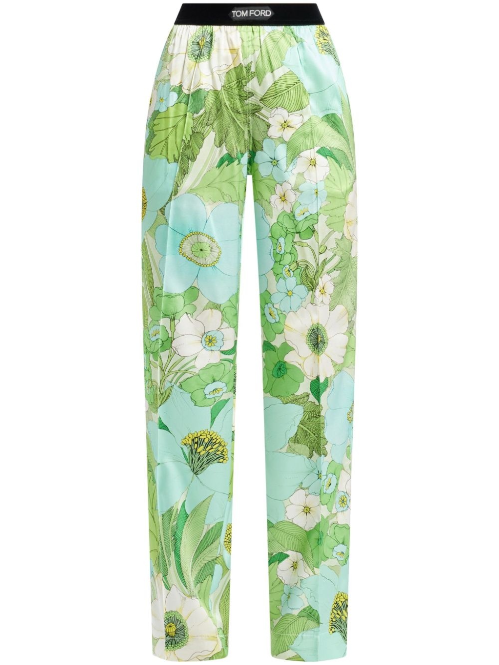 logo-waistband floral-print trousers Highlights - Green - Silk blend - Logo waistband - Floral print - Two diagonal pockets to the sides - Straight leg Made in Italy Composition Outer: Silk 94%, Elastane 6% Lining: Polyamide 90%, Elastane 10% Washing instructions Read Manufacturer Guidelines