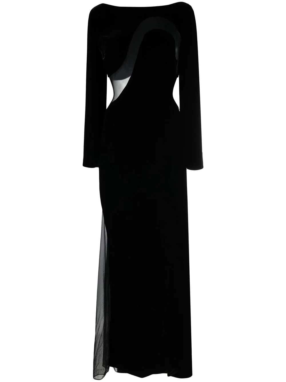 Mesh-panelled velvet gown black velvet effect mesh panelling draped detailing boat neck concealed rear zip fastening long sleeves long length silk lining Made in Italy Composition Lining: Silk 100% Outer: Polyamide 84%, Viscose 69%, Cupro 31%, Elastane 16% SIZE & FIT Model measurements Height 5 ft 10 in(1.77 m) Bust/Chest 34.64 in(88 cm) Hips 35.43 in(90 cm) Waist 24.8 in(63 cm) Measurement HIPS 36.22 in(92 cm) WAIST 26.77 in(68 cm) FittingInformation This piece fits true to size. We recommend you get your regular size Designed for a close fit at the bust, waist and hips Made with a mid-weight fabric Washing instructions Dry Clean Only