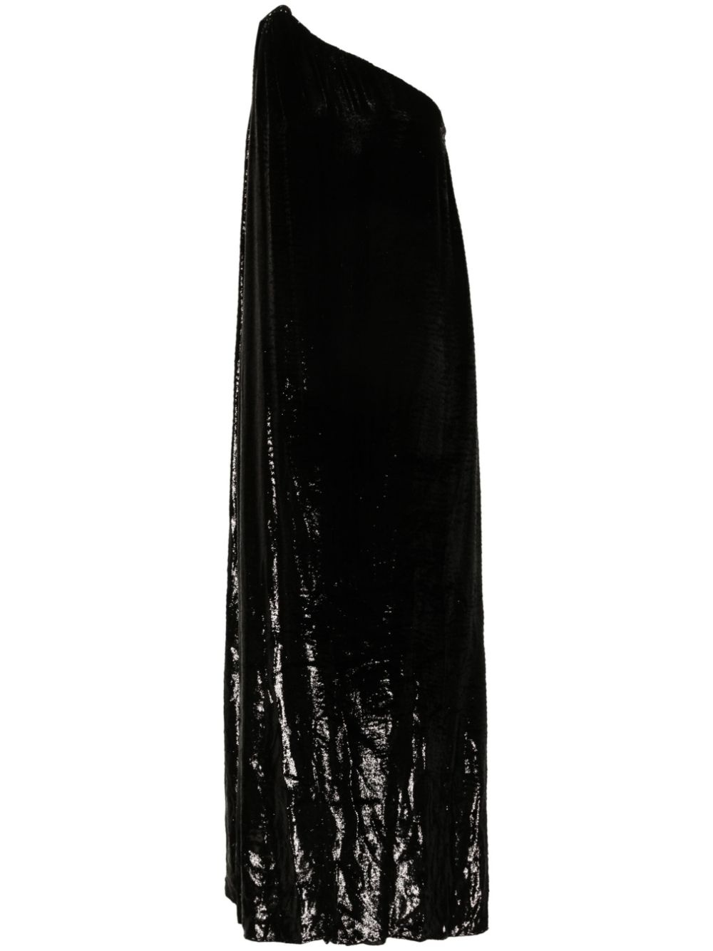 one-shoulder lame-effect dress Highlights - Black - Lame effect - Short-fringed design - Cape design - One-shoulder - Sleeveless - Two side inset pockets - Front slit - Long length - Straight hem - Concealed side hook and zip fastening Made in Italy Composition Lining: Silk 100% Outer: Polyamide 75%, Silk 25% SIZE & FIT Model measurements Height 5 ft 11 in(1.8 m) Bust/Chest 31.49 in(80 cm) Hips 35.82 in(91 cm) Waist 24.8 in(63 cm) FittingInformation Designed to be unstructured, offering a loose fit throughout Made from a midweight non-stretch fabric This piece fits true to size – take your usual size