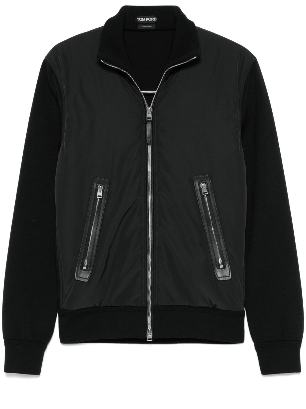 panelled jacket Following Tom Ford's timeless sleek style, this bomber jacket arrives in an all-black hue. Its design is crafted from a mix of cotton and wool and features two side zip pockets for storage. Highlights - Black - Front two-way zip fastening - Ribbed cuffs and hem - Two side zip-fastening pockets - Internal zip-fastening pocket Made in Italy Composition Outer: Polyester 100%, Lamb Skin 100%, Wool 90%, Elastane 5%, Polyamide 5% Lining: Cotton 100% SIZE & FIT Model measurements Height 6 ft 1 in(1.85 m) Bust/Chest 35.82 in(91 cm) Hips 37.79 in(96 cm) Waist 29.13 in(74 cm) FittingInformation Designed for a relaxed fit, this piece allows for comfort and movement when worn The ribbed hem offers a close, comfortable fit Made from a midweight non-stretch fabric