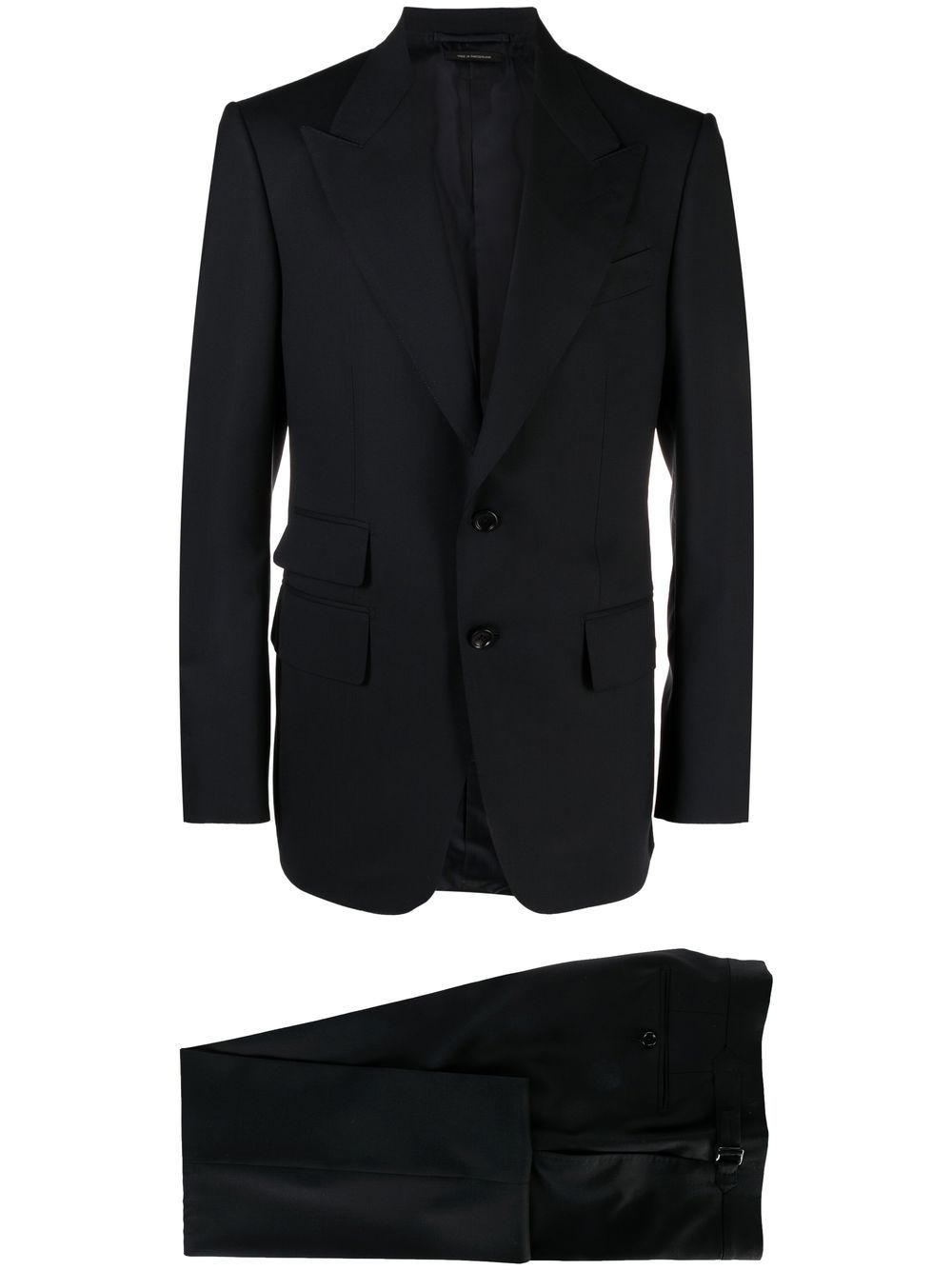 peaked lapels tailored suit Spun from delicate wool and lined with fluid silk, this navy blue single-breasted suit from Tom Ford is cut for a tailored fit and punctuated with impeccable details throughout as a nod to the brand's craftsmanship and penchant for timeless designs. Boasting wide peaked lapels, this two-piece set features flap pockets and contrasting stitching. Highlights - Navy blue - Wool/silk - Tailored design - Front button fastening - Wide peak lapels - Chest welt pocket - Three side flap pockets - Buttoned cuffs - Italian rear vents - Concealed front fastening - Side buckle fastening - Two side slit pockets Imported Composition Lining: Silk 100%, Cupro 50% Outer: Wool 100% SIZE & FIT Model measurements Height 6 ft 2 in(1.87 m) Bust/Chest 36.22 in(92 cm) Hips 37 in(94 cm) Waist 27.95 in(71 cm) FittingInformation This piece fits true to size. We recommend you get your regular size Classic fit Made with a mid-weight non-stretch fabric Washing instructions Specialist Cleaning