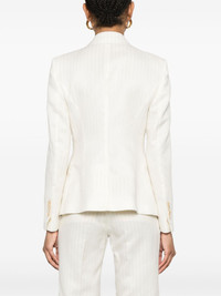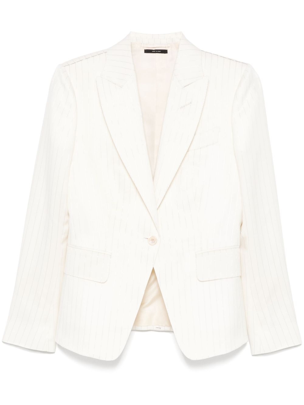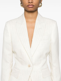 pinstriped blazer Highlights - Light beige - Front button fastening - Shoulder pads - Chest welt pocket - Two side flap pockets Made in Italy Composition Outer: Wool 74%, Silk 24%, Viscose 1%, Metallised Fibres 1% Lining: Cupro 59%, Silk 41% SIZE & FIT Model measurements Height 5 ft 10 in(1.78 m) Bust/Chest 32.67 in(83 cm) Hips 35.43 in(90 cm) Waist 23.22 in(59 cm) FittingInformation Designed for a slim fit that sits just away from the body offering a close yet comfortable fit The internal shoulder pads offer a structured shape Made from a midweight non-stretch fabric