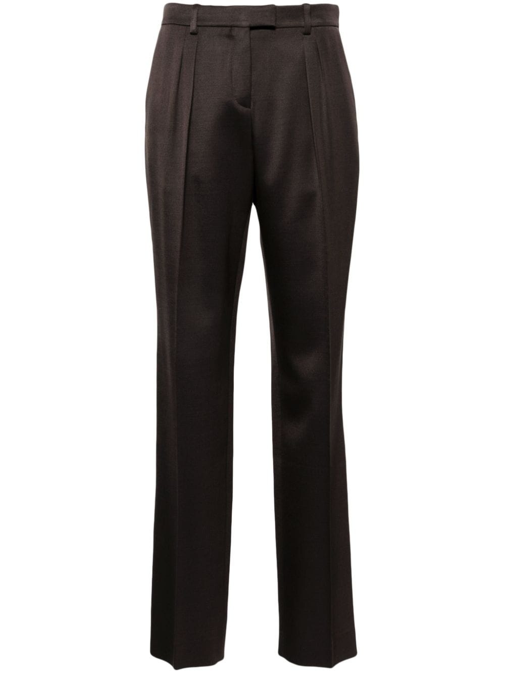 pleated trousers Highlights - Dark cedar brown - Silk virgin-wool blend - Twill weave - Tailored design - Belt loops - Two side slash pockets - Front pleat detailing - Pressed crease - Full-length - Two rear button-fastening jetted pockets - Concealed front button, hook and zip fastening Made in Italy Composition Outer: Silk 51%, Virgin Wool 49% Lining: Cupro 59%, Silk 41% SIZE & FIT Model measurements Height 5 ft 10 in(1.77 m) Bust/Chest 32.28 in(82 cm) Hips 35.03 in(89 cm) Waist 25.19 in(64 cm) FittingInformation Designed for a tapered fit, these trousers allow for a close fit at the waist and a loose unrestricted fit over the leg with a closer fit towards the ankle Made from a midweight non-stretch fabric This piece fits true to size – take your usual size