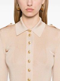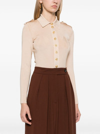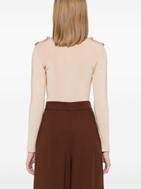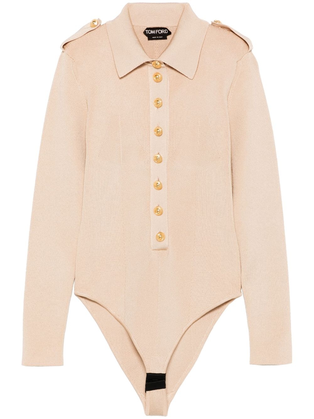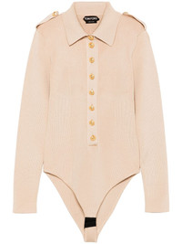 ribbed-knit bodysuit Highlights - Sesame beige - Fine ribbed - Front button fastening - Hook and eye fastening - Classic collar - Epaulettes - Long sleeves - High cut - Just a reminder that this piece must be tried on over your own garments. Made in Italy Composition Viscose 67%, Polyamide 31%, Polyurethane 2% SIZE & FIT Model measurements Height 5 ft 9 in(1.75 m) Bust/Chest 31.88 in(81 cm) Hips 34.64 in(88 cm) Waist 24.01 in(61 cm) FittingInformation Designed for a close fit throughout The internal shoulder pads offer a structured shape Made from a midweight non-stretch fabric, this piece offers minimal elasticity when worn