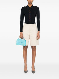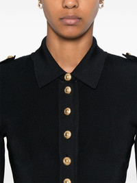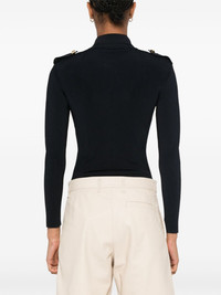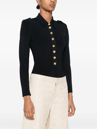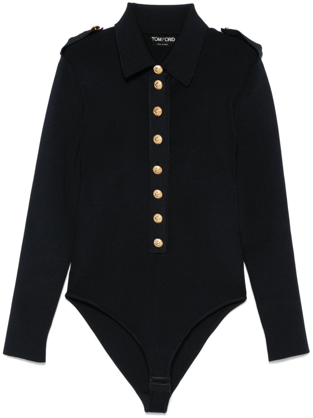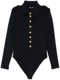 ribbed-knit bodysuit Highlights - Navy blue - Ribbed knit - Front button fastening - Hook fastening - Polo collar - Epaulettes - Shoulder pads - Long sleeves - Unlined - Just a reminder that this piece must be tried on over your own garments. Made in Italy Composition Viscose 67%, Polyamide 31%, Polyurethane 2% SIZE & FIT Model measurements Height 5 ft 10 in(1.77 m) Bust/Chest 33.07 in(84 cm) Hips 37 in(94 cm) Waist 24.8 in(63 cm) FittingInformation Designed for a close fit throughout The internal shoulder pads offer a structured shape Made with a midweight knit, this piece offers some stretch
