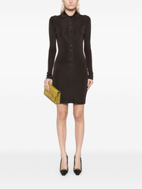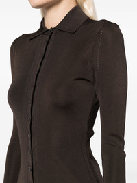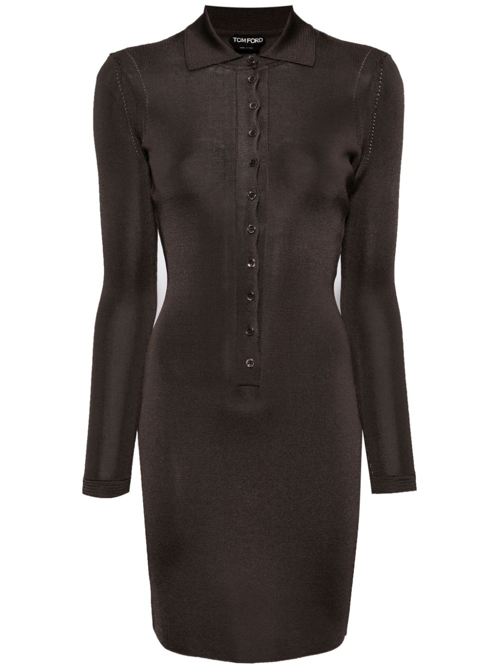 ribbed mini dress Highlights - Bitter chocolate brown - Ribbed knit - Polo collar - Long sleeves - Mother-of-pearl buttons - Straight hem - Unlined Made in Italy Composition Viscose 100% SIZE & FIT Model measurements Height 5 ft 9 in(1.76 m) Bust/Chest 31.1 in(79 cm) Hips 35.03 in(89 cm) Waist 24.4 in(62 cm) FittingInformation Designed for a slim fit that sits just away from the body offering a close yet comfortable fit Made with a midweight knit, this piece offers some stretch Washing instructions Machine Wash