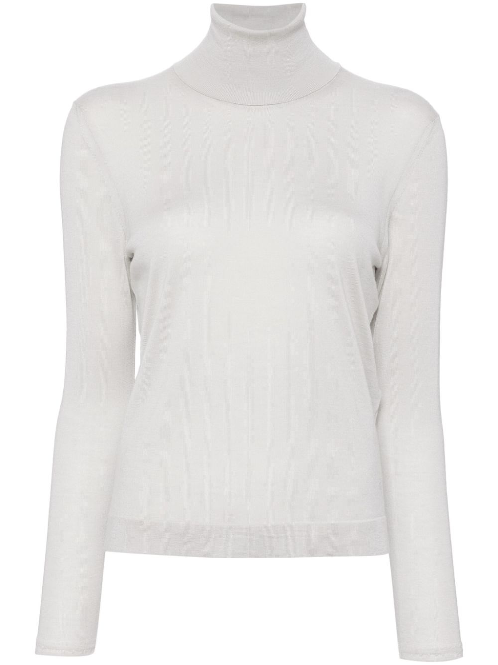 roll-neck jumper Highlights - Cool grey - Cashmere-silk blend - Roll neck - Knitted construction - Semi-sheer construction - Long sleeves - Straight hem Made in Italy Composition Cashmere 70%, Silk 30% SIZE & FIT Model measurements Height 5 ft 9 in(1.76 m) Bust/Chest 31.1 in(79 cm) Hips 35.03 in(89 cm) Waist 24.4 in(62 cm) FittingInformation Designed for a slim fit that sits just away from the body offering a close yet comfortable fit The ribbed hem offers a close, comfortable fit Made with a fine knit, this piece offers some stretch