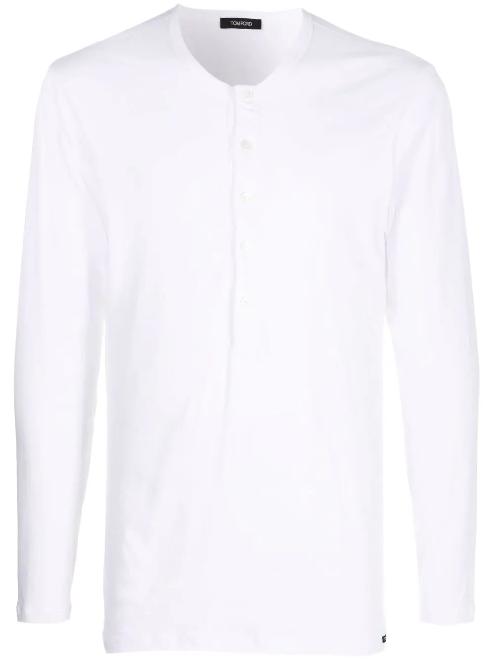 round-neck Henley T-shirt white stretch-cotton jersey knit Henley neck front button placket long sleeves straight hem Made in Italy Composition Cotton 95%, Spandex/Elastane 5% SIZE & FIT Model measurements Height 6 ft 1 in(1.86 m) Bust/Chest 35.43 in(90 cm) Hips 35.43 in(90 cm) Waist 29.92 in(76 cm) Measurement CHEST 37.79 in(96 cm) SLEEVE LENGTH 31.88 in(81 cm) LENGTH 29.13 in(74 cm) Shoulder Width 15.74 in(40 cm) FittingInformation This piece fits true to size. We recommend you get your regular size Cut for a relaxed fit Made with a mid-weight stretch fabric Washing instructions Machine Wash