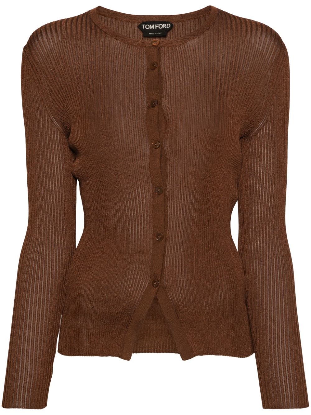 round-neck ribbed cardigan Highlights - Camel brown - Ribbed knit - Round neck - Long sleeves - Straight hem - Front button fastening Made in Italy Composition Viscose 87%, Polyamide 13% SIZE & FIT Model measurements Height 5 ft 10 in(1.78 m) Bust/Chest 33.07 in(84 cm) Hips 36.61 in(93 cm) Waist 24.8 in(63 cm) FittingInformation Designed for a close fit throughout Made with a midweight knit, this piece offers some stretch This piece fits true to size – take your usual size
