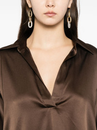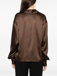 satin blouse Highlights - Coffee brown - Polo collar - V-neck - Buttoned-cuff sleeves Made in Italy Composition Silk 94%, Elastane 6% SIZE & FIT Model measurements Height 5 ft 9 in(1.74 m) Bust/Chest 33.85 in(86 cm) Hips 35.03 in(89 cm) Waist 24.01 in(61 cm) FittingInformation Designed to be unstructured, offering a loose fit throughout Made from a midweight stretch fabric, this piece offers elasticity and flexibility when worn Washing instructions Dry Clean Only