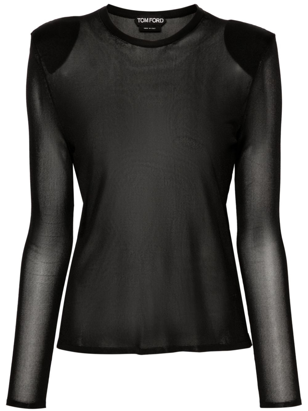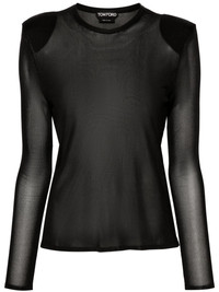 semi-sheer jersey-knit T-shirt Highlights - Black - Semi-sheer construction - Jersey knit - Crew neck - Shoulder pads - Long sleeves - Straight hem Made in Italy Composition Viscose 100% SIZE & FIT Model measurements Height 5 ft 10 in(1.78 m) Bust/Chest 31.49 in(80 cm) Hips 37 in(94 cm) Waist 23.62 in(60 cm) FittingInformation Designed for a relaxed fit, this piece allows for comfort and movement when worn Made from a midweight non-stretch fabric, this piece offers minimal elasticity when worn This piece fits true to size – take your usual size Washing instructions Dry Clean Only