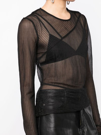 sheer ribbed long-sleeve jersey top Highlights - Black - Panelled design - Sheer - Fine ribbed - Crew neck - Long sleeves - Straight hem Made in Italy Composition Polyamide 100% SIZE & FIT Model measurements Height 5 ft 10 in(1.77 m) Bust/Chest 31.49 in(80 cm) Hips 35.43 in(90 cm) Waist 25.19 in(64 cm) FittingInformation Designed for a slim fit that sits just away from the body offering a close yet comfortable fit Made from a lightweight non-stretch fabric, this piece offers minimal elasticity when worn This piece fits true to size – take your usual size Washing instructions Dry Clean Only