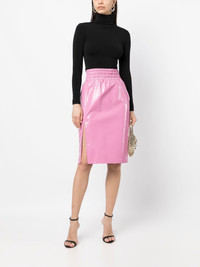 high-shine finish midi skirt Highlights - Bubblegum pink - Calf leather - Stretch-design - High-shine finish - Elasticated waistband - Two side slash pockets - Front-side slit - Knee-length - Straight hem - Tonal stitching Made in Italy Composition Calf Leather 92%, Elastane 8% SIZE & FIT Model measurements Height 5 ft 10 in(1.78 m) Bust/Chest 33.07 in(84 cm) Hips 33.85 in(86 cm) Waist 25.19 in(64 cm) FittingInformation This piece fits true to size. We recommend you get your regular size Designed to be fitted at the waist, loose over the leg Made with a mid-weight non-stretch fabric Washing instructions Dry Clean Only