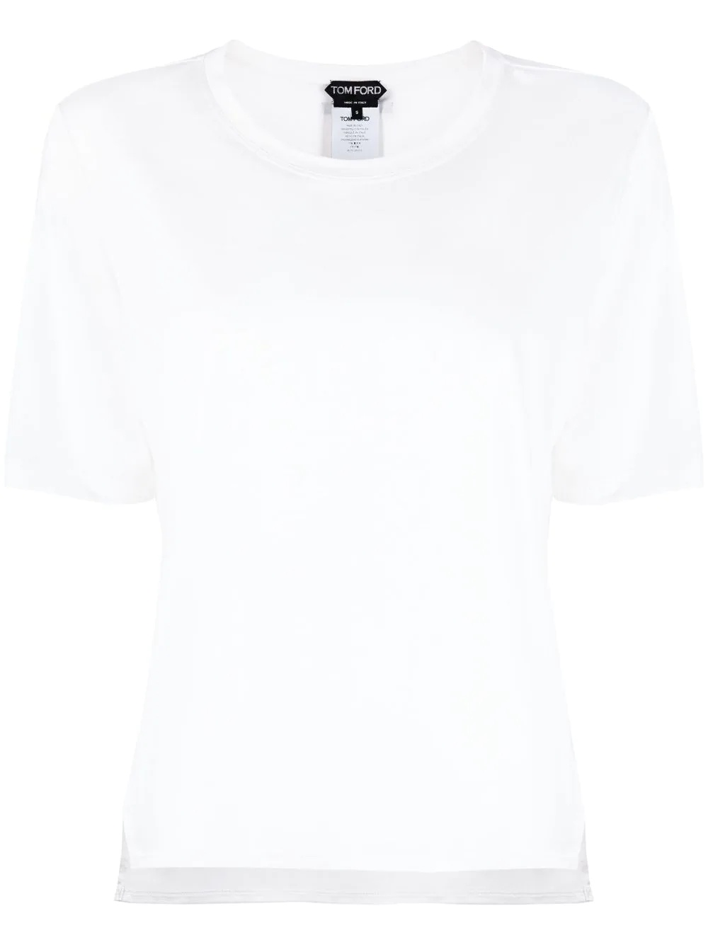 side slit T-shirt Tom Ford adds its glamorous appeal to the casual silhouette of this T-shirt. Crafted from white silk, this classic casual look is transformed by slits towards the sides and finished with a round neck and short sleeves. Made In Italy Composition Silk 100% SIZE & FIT Model measurements Height 5 ft 9 in(1.76 m) Bust/Chest 34.25 in(87 cm) Hips 36.22 in(92 cm) Waist 25.19 in(64 cm) FittingInformation This piece fits true to size. We recommend you get your regular size Cut for a relaxed fit Made with a mid-weight fabric Washing instructions Dry Clean Only
