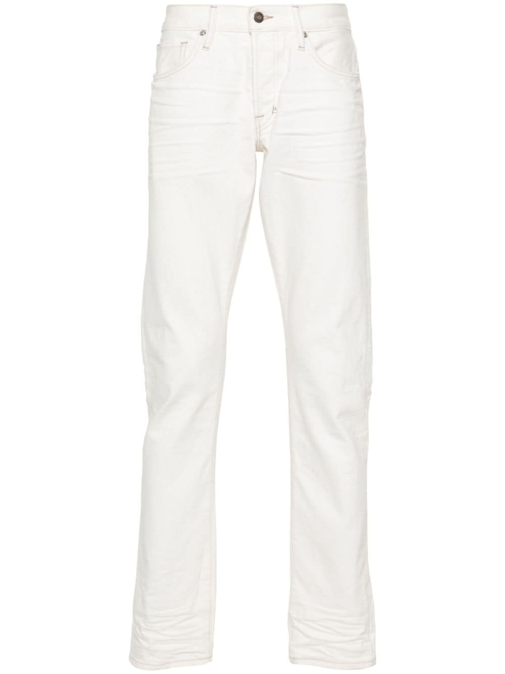 slim-leg jeans These white TOM FORD jeans are cut from rigid denim to a slim-leg profile with crinkled whiskering that lends them a worn feel without using washing or fading. Highlights - Cream white - Denim - Contrast stitching - Mid-rise - Belt loops - Whiskering effect - Embroidered logo to the front - Classic five pockets - Logo patch to the rear - Button fly fastening Made in United States Composition Outer: Cotton 98%, Polyurethane 2% Lining: Cotton 100% SIZE & FIT Model measurements Height 6 ft 2 in(1.88 m) Bust/Chest 36.61 in(93 cm) Hips 35.82 in(91 cm) Waist 27.95 in(71 cm) FittingInformation Designed for a slim tapered leg, these jeans offer a close fit that sits just away from the leg with a closer fit towards the ankle Sturdy and hard-wearing, this denim piece offers no stretch This piece fits true to size – take your usual size Washing instructions Dry Clean Only
