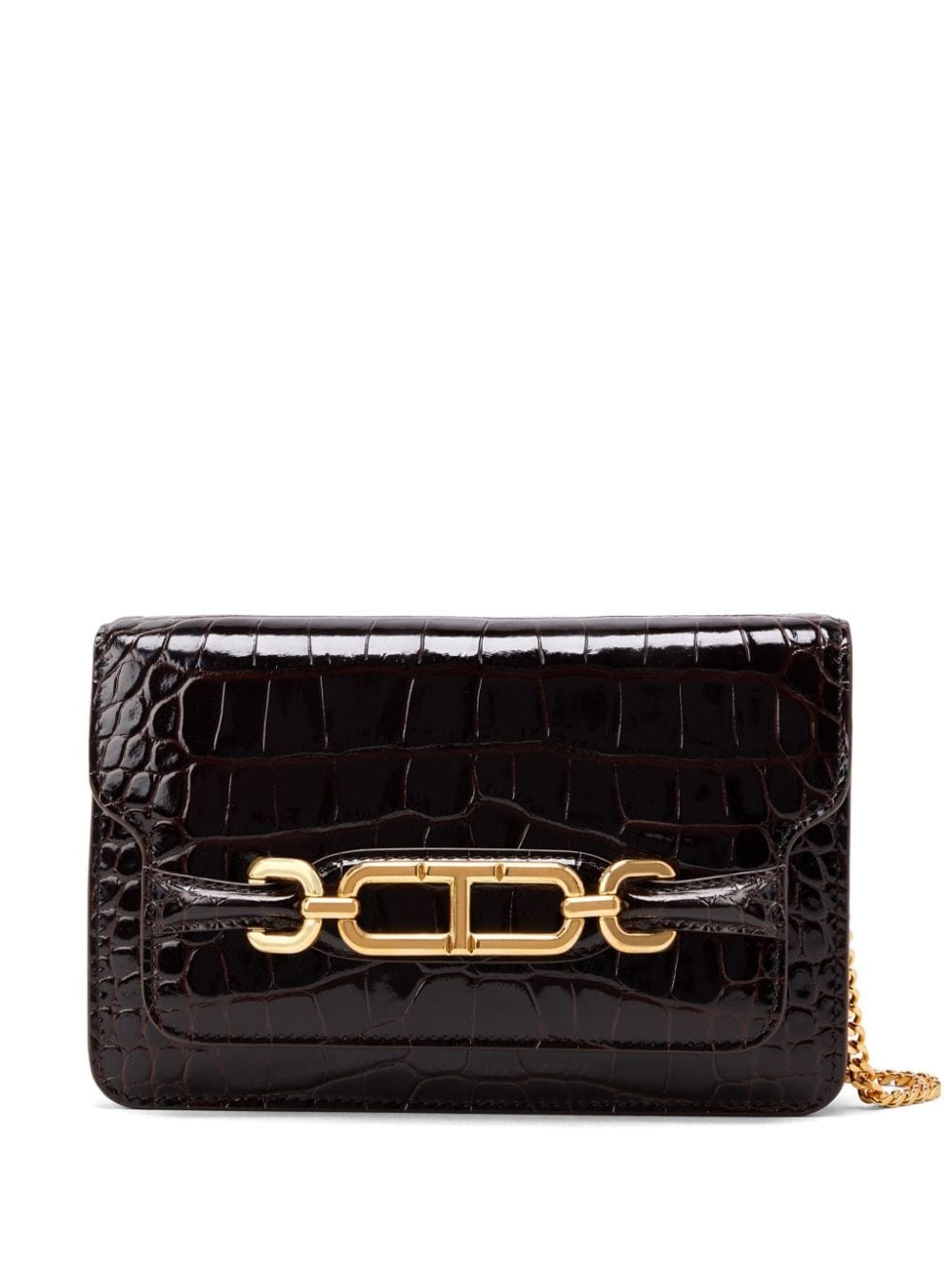 small Whitney crocodile-embossed shoulder bag Highlights - Coffee brown - Calf leather - Embossed crocodile effect - Gold-tone logo plaque - Chain-link shoulder strap - Foldover top with magnetic fastening - Main compartment - Internal patch pocket - Internal logo stamp - Gold-tone hardware Made in Italy Composition Outer: Sheepskin 100%, Calf Leather 100% SIZE & FIT Measurement DEPTH 1.57 in(4 cm) HEIGHT 5.9 in(15 cm) WIDTH 8.66 in(22 cm) STRAP 19.68 in(50 cm)