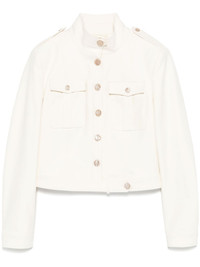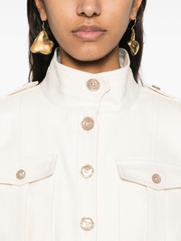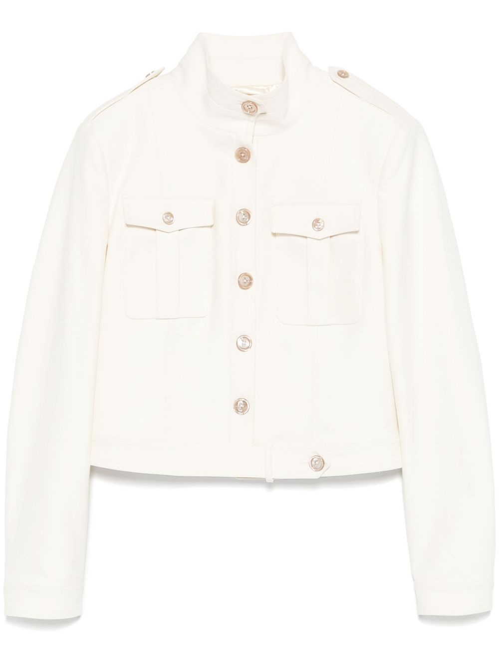 stand-up collar cropped jacket Highlights - Ecru - Front button fastening - Epaulettes - Shoulder pads - Two chest flap pockets Made in Italy Composition Outer: Cotton 97%, Elastane 3% Lining: Cotton 56%, Viscose 44% SIZE & FIT Model measurements Height 5 ft 9 in(1.76 m) Bust/Chest 31.1 in(79 cm) Hips 36.61 in(93 cm) Waist 24.8 in(63 cm) FittingInformation Designed for a relaxed fit, this piece allows for comfort and movement when worn The internal shoulder pads offer a structured shape Made from a midweight fabric