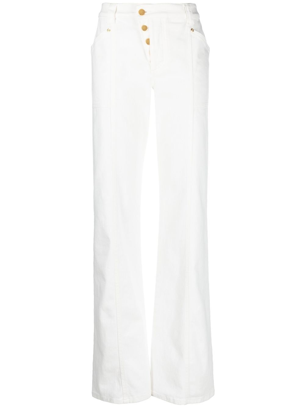 straight-leg trousers Arriving in a fresh white hue, these straight-leg trousers from TOM FORD are accented with a contemporary off-centre front button fastening. Made in Italy Composition Outer: Cotton 97%, Elastane 3% Lining: Cotton 100% SIZE & FIT Model measurements Height 5 ft 10 in(1.79 m) Bust/Chest 31.1 in(79 cm) Hips 35.03 in(89 cm) Waist 24.01 in(61 cm) FittingInformation This piece fits true to size. We recommend you get your regular size Designed to be fitted at the waist and hips, loose over the leg Made with a mid-weight stretch fabric Washing instructions Machine Wash