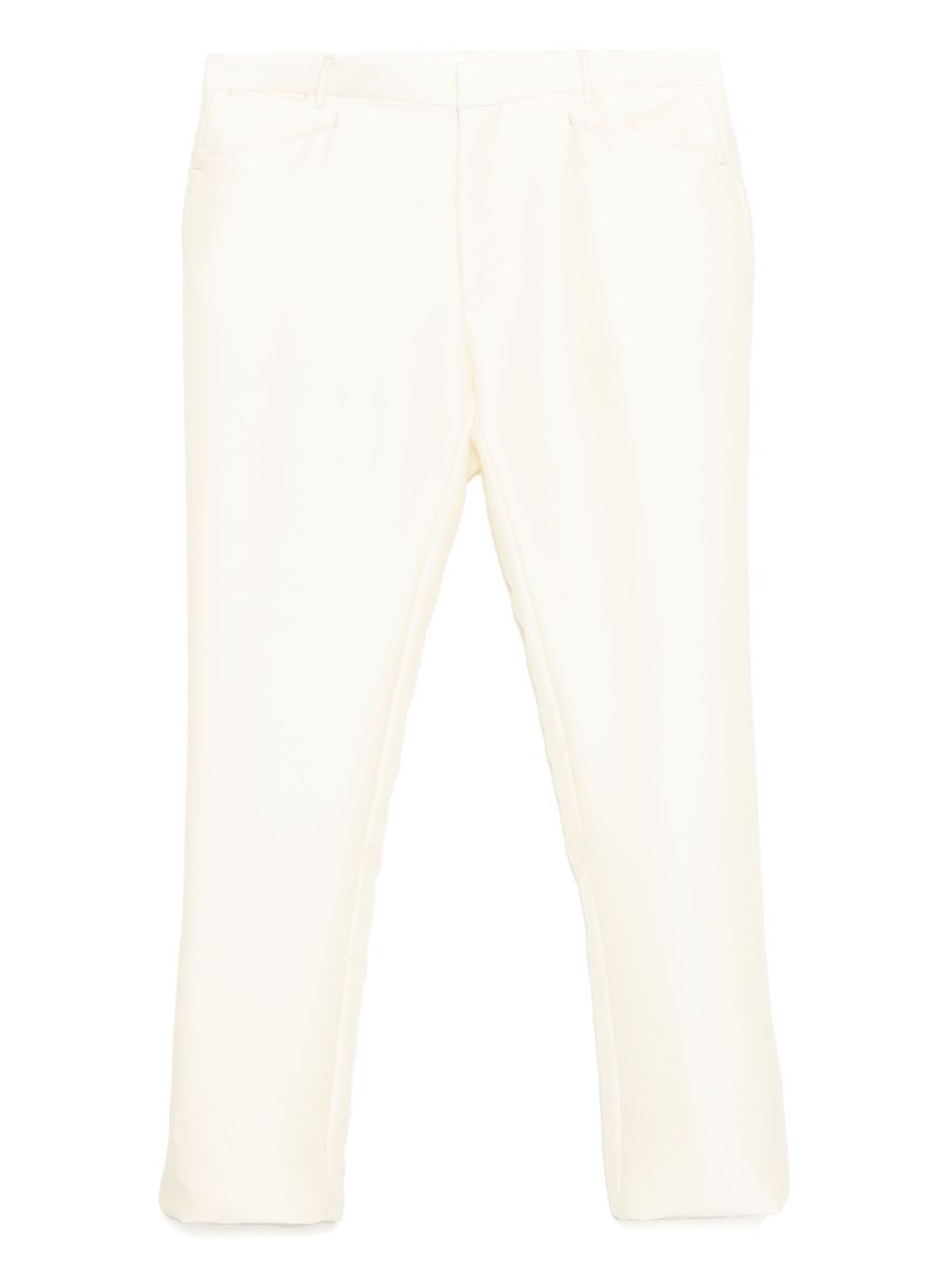 straight-leg trousers Highlights - Ivory white - Concealed front button, hook and zip fastening - Belt loops - Two side inset pockets - Two rear button-fastening pockets Made in Italy Composition Outer: Wool 55%, Mohair 40%, Silk 10% Lining: Cupro 100% SIZE & FIT Model measurements Height 6 ft 2 in(1.87 m) Bust/Chest 33.07 in(84 cm) Hips 35.43 in(90 cm) Waist 26.77 in(68 cm) FittingInformation Designed for a tapered leg, offering a loose unrestricted fit over the leg with a closer fit towards the ankle The unfinished hems allow for the length to be altered Made from a midweight non-stretch fabric