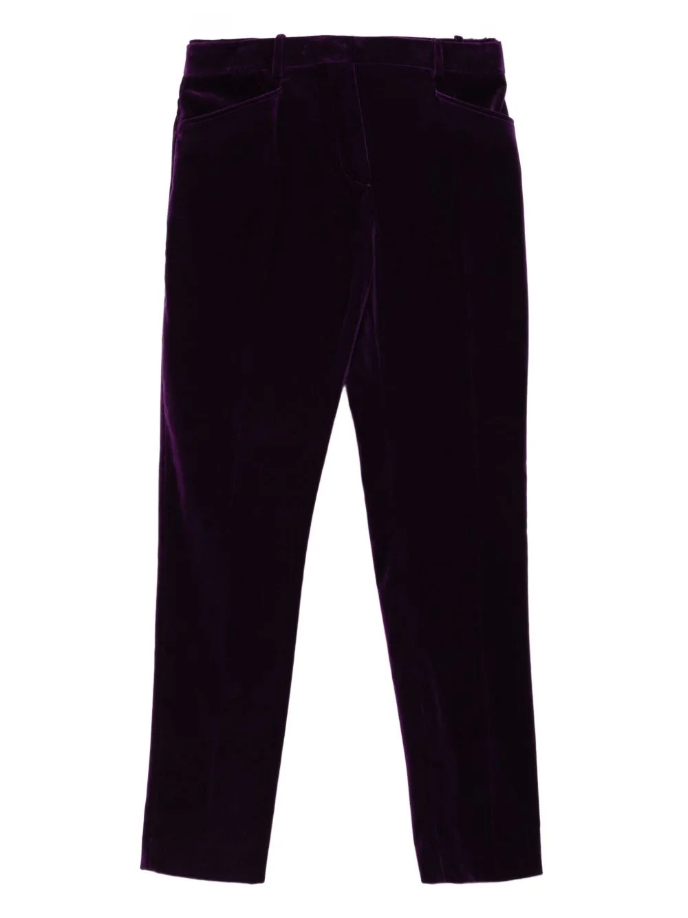 straight-leg trousers Highlights - Plum purple - Concealed front button, hook and zip fastening - Two side inset pockets - Two rear jetted pockets Made in Italy Composition Outer: Cotton 98%, Elastane 2% Lining: Cupro 59%, Silk 41% SIZE & FIT Model measurements Height 5 ft 10 in(1.78 m) Bust/Chest 31.88 in(81 cm) Hips 37 in(94 cm) Waist 25.19 in(64 cm) FittingInformation Designed with a cigarette cut, these trousers allow for a close fit at the waist and offer an unrestricted fit through to the ankle Made from a midweight stretch fabric, this piece offers elasticity and flexibility when worn Washing instructions Dry Clean Only
