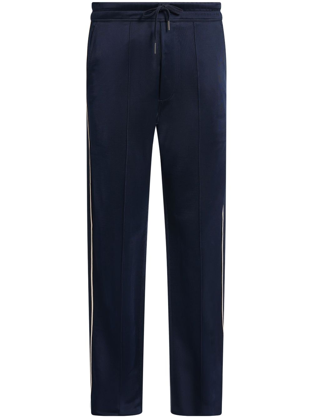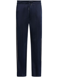 straight-leg trousers Highlights - Navy blue - Elasticated drawstring waistband - Two side slash pockets - Two rear flap pockets - Side stripe detailing Made in Italy Composition Outer: Buffalo Horn 100%, Viscose 83%, Spandex/Elastane 17% Lining: Cotton 100%