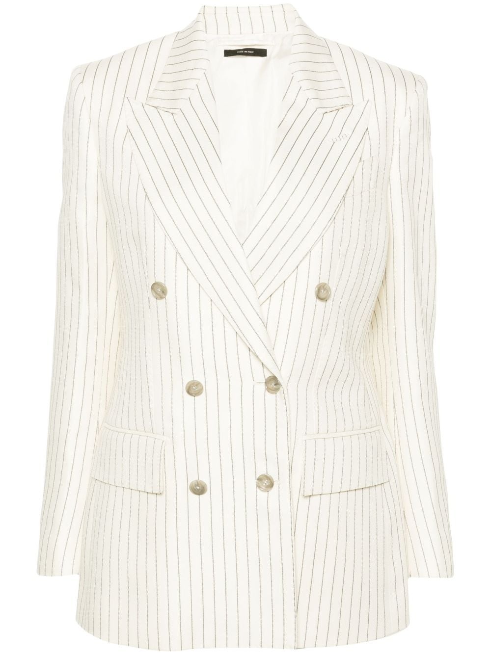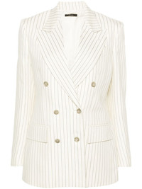 striped double-breasted twill blazer Highlights - Ecru - Wool blend - Twill weave - Vertical stripe pattern - Peak lapels - Double-breasted button fastening - Shoulder pads - Long sleeves - Buttoned cuffs - Chest welt pocket - Two front flap pockets - Italian rear vents - Straight hem - Satin lining Made in Italy Composition Outer: Wool 79%, Silk 17%, Polyester 4% Lining: Silk 50%, Cupro 50% SIZE & FIT Model measurements Height 5 ft 9 in(1.76 m) Bust/Chest 31.88 in(81 cm) Hips 35.43 in(90 cm) Waist 24.8 in(63 cm) FittingInformation Designed for a slim fit that sits just away from the body offering a close yet comfortable fit The internal shoulder pads offer a structured shape Made from a midweight non-stretch fabric This piece fits true to size – take your usual size Measurement SLEEVE LENGTH 22 in(55.9 cm) LENGTH 27 in(68.6 cm) WAIST 30.98 in(78.7 cm) BUST 32 in(81.3 cm) Washing instructions Dry Clean Only