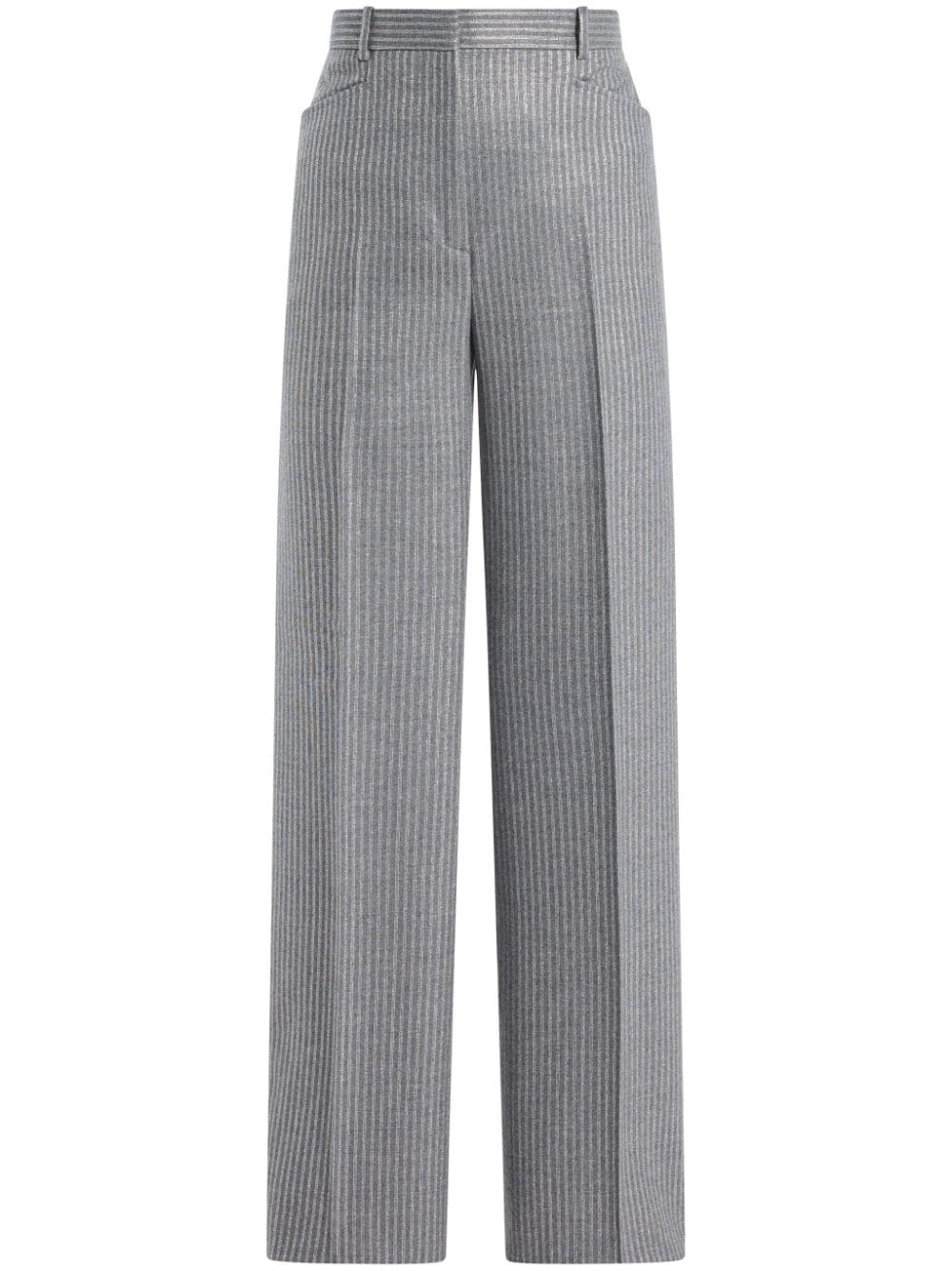 striped trousers Highlights - Medium grey - Wool blend - Metallic threading - Vertical stripe pattern - Pressed crease - Mid-rise - Belt loops - Concealed front button, hook and zip fastening - Two front patch pockets - Two rear button-fastening jetted pockets - Flared leg - Tailored cut Made in Italy Composition Lining: Cupro 59%, Silk 41% Outer: Buffalo Horn 100%, Mother of Pearl 100%, Virgin Wool 91%, Metallized Polyester 9%
