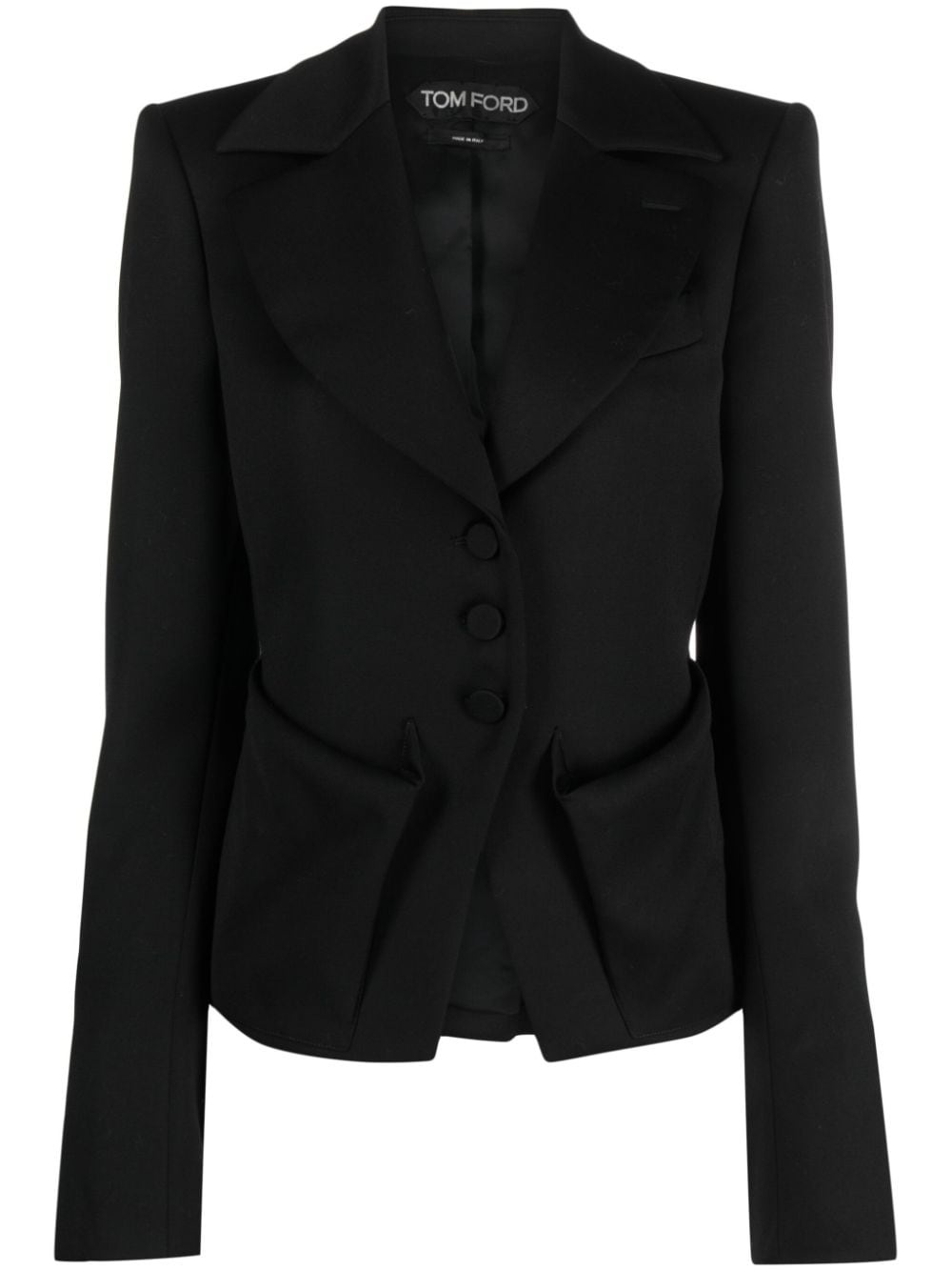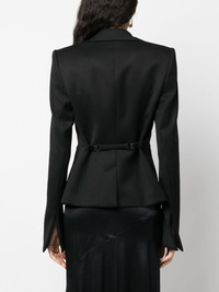 tailored single-breasted blazer Highlights - Black - Virgin wool - Tailored cut - Wide notch lapels - Front button fastening - Shoulder pads - Long sleeves - Split cuffs - Adjustable strap to the rear - Chest welt pocket - Two front patch pockets Made in Italy Composition Outer: Virgin Wool 100% Lining: Viscose 54%, Polyester 46% SIZE & FIT Model measurements Height 5 ft 10 in(1.79 m) Bust/Chest 33.07 in(84 cm) Hips 35.82 in(91 cm) Waist 24.01 in(61 cm) FittingInformation Designed for a slim fit that sits just away from the body offering a close yet comfortable fit The internal shoulder pads offer a structured shape Made from a midweight non-stretch fabric This piece fits true to size – take your usual size Washing instructions Dry Clean Only