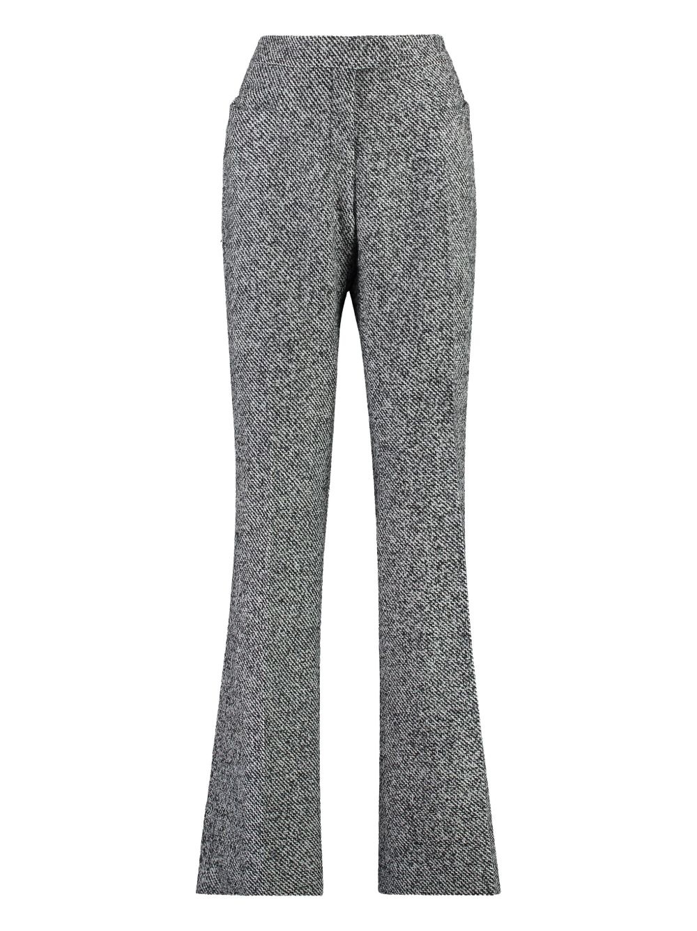 tweed flared trousers Highlights - Medium grey - Concealed front fastening - Two side pouch pockets - Two rear jetted pockets Made in Italy Composition Outer: Virgin Wool 60%, Alpaca Wool 27%, Polyamide 13% Lining: Viscose 54%, Polyester 46% Washing instructions Read Manufacturer Guidelines