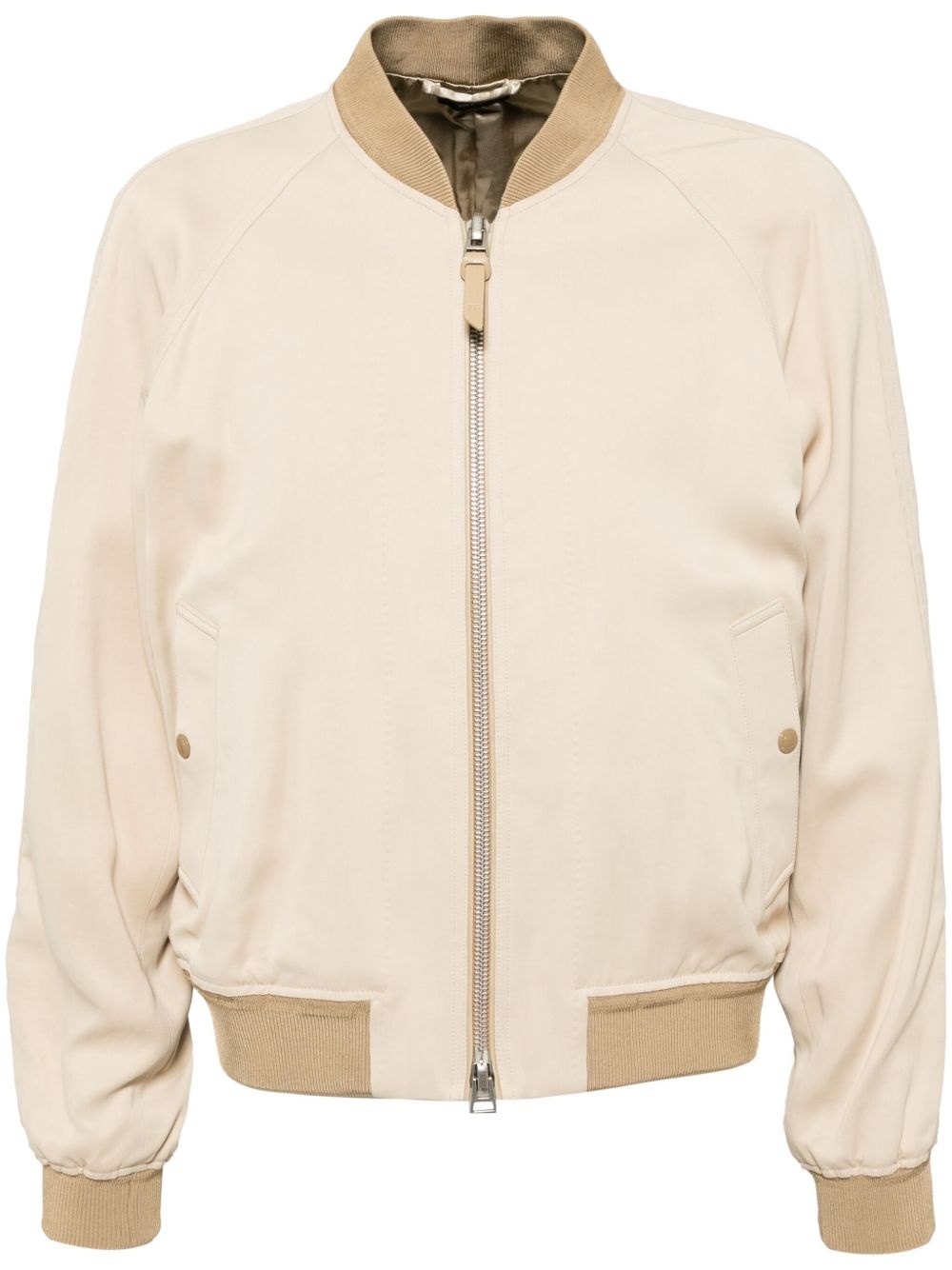 twill bomber jacket Highlights - Light beige - Front zip fastening - Baseball collar - Two side button-fastening pockets - Ribbed cuffs and hem Made in Italy Composition Outer: Acetate 51%, Viscose 49% Lining: Cupro 60%, Cotton 40% SIZE & FIT FittingInformation Designed for a relaxed fit, this piece allows for comfort and movement when worn The ribbed hem offers a close, comfortable fit Made from a midweight non-stretch fabric
