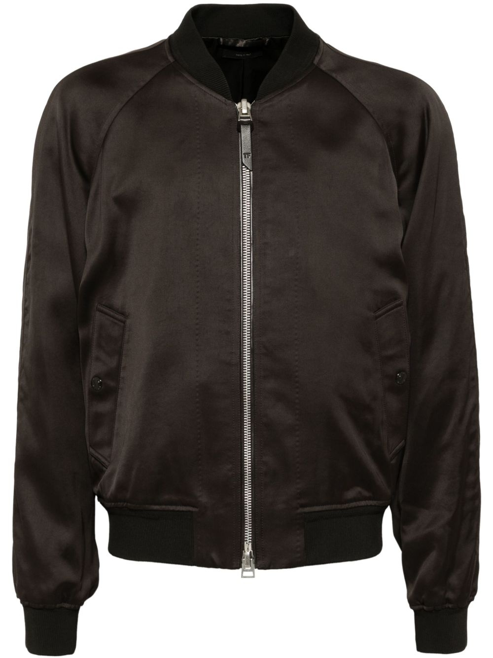 twill bomber jacket Highlights - Chocolate brown - Front two-way zip fastening - Baseball collar - Two side button-fastening pockets - Ribbed cuffs and hem Made in Italy Composition Outer: Acetate 51%, Viscose 49% Lining: Cupro 60%, Cotton 40% SIZE & FIT FittingInformation Designed for a relaxed fit, this piece allows for comfort and movement when worn The ribbed hem offers a close, comfortable fit Made from a midweight non-stretch fabric