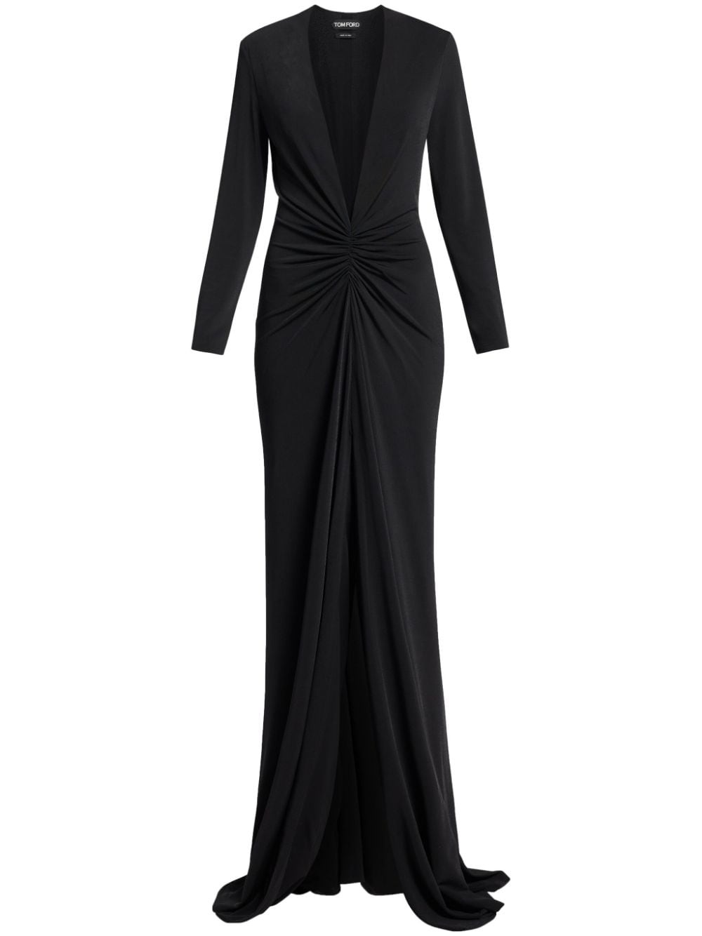 v-neck long sleeve dress Highlights - Black - Stretch-design - Plunging v-neck - Gathered detailing - Long sleeves - Front slit - Straight hem Made in Italy Composition Lining: Viscose 100% Outer: Viscose 83%, Polyamide 11%, Elastane 6%