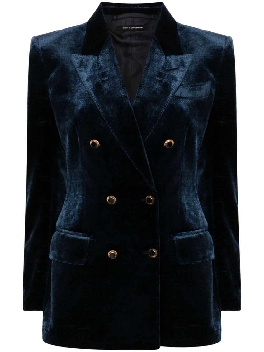 velvet double-breasted blazer Highlights - Midnight blue - Velvet - Dart detailing - Gold-tone buttons - Peak lapels - Double-breasted button fastening - Shoulder pads - Long sleeves - Buttoned cuffs - Chest welt pocket - Two side flap pockets - American rear vent - Straight hem - Full lining Made in Italy Composition Lining: Cupro 59%, Silk 41% Outer: Polyester 100% SIZE & FIT Model measurements Height 5 ft 9 in(1.76 m) Bust/Chest 31.88 in(81 cm) Hips 35.43 in(90 cm) Waist 24.8 in(63 cm) FittingInformation Designed for a slim fit that sits just away from the body offering a close yet comfortable fit The internal shoulder pads offer a structured shape Made from a midweight non-stretch fabric This piece fits true to size – take your usual size