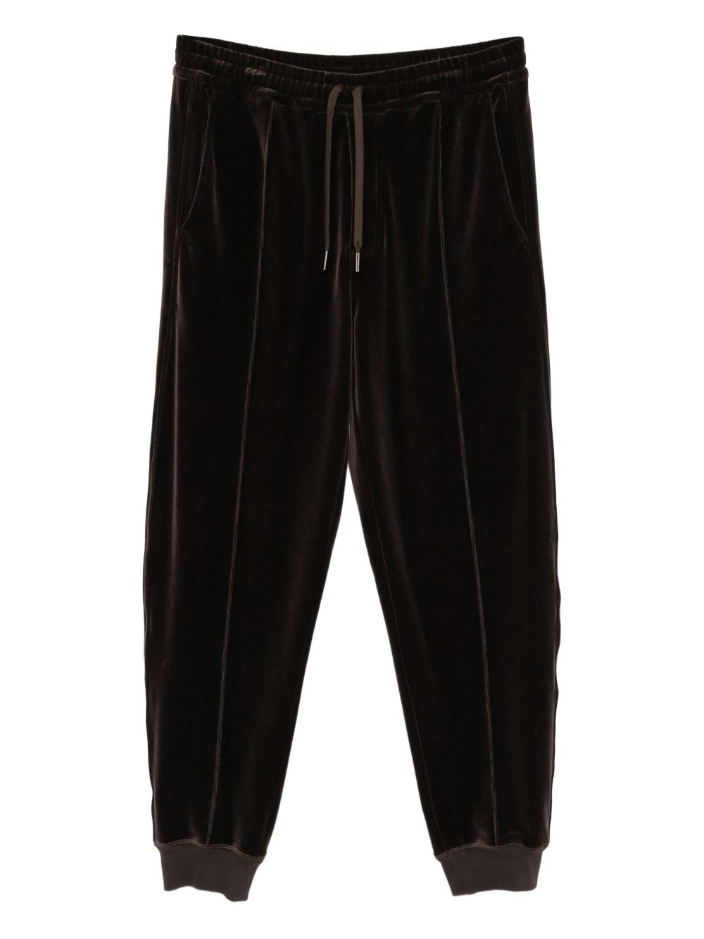 velvet drawstring trousers Highlights - Dark brown - Velour texture - Drawstring waistband - Side seam detail - Cuffed hems - Welt pocket Made in Italy Composition Lining: Cotton 100% Outer: Cotton 80%, Polyamide 18%, Elastane 2% SIZE & FIT Model measurements Height 6 ft 3 in(1.9 m) Bust/Chest 19.29 in(49 cm) Hips 38.58 in(98 cm) Waist 32.28 in(82 cm) FittingInformation Designed for a tapered leg, offering a loose unrestricted fit over the leg with a closer fit towards the ankle The ribbed hem at the ankle offers a close, comfortable fit Made from a midweight stretch fabric, this piece offers elasticity and flexibility when worn Washing instructions Dry Clean Only