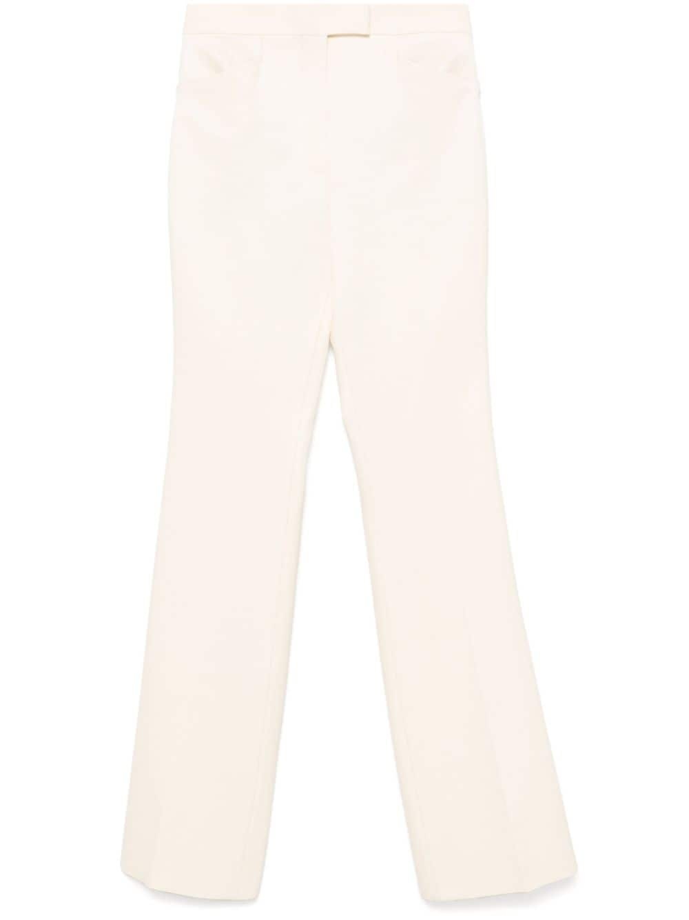 wide-leg tailored trousers Highlights - Cream white - Wool-silk blend - Lustrous finish - Wide leg - Tailored design - Concealed front button, hook and zip fastening - Two side slit pockets - Pressed crease - Side satin trim - Two rear button-fastening jetted pockets - Full-length Made in Italy Composition Lining: Cupro 59%, Silk 41% Outer: Wool 90%, Silk 10% SIZE & FIT Model measurements Height 5 ft 11 in(1.8 m) Bust/Chest 32.67 in(83 cm) Hips 36.22 in(92 cm) Waist 24.4 in(62 cm) FittingInformation Designed with a flared hem, these trousers allow for a close fit at the waist with a slim fit over the leg and widening towards the hem Made from a midweight non-stretch fabric