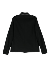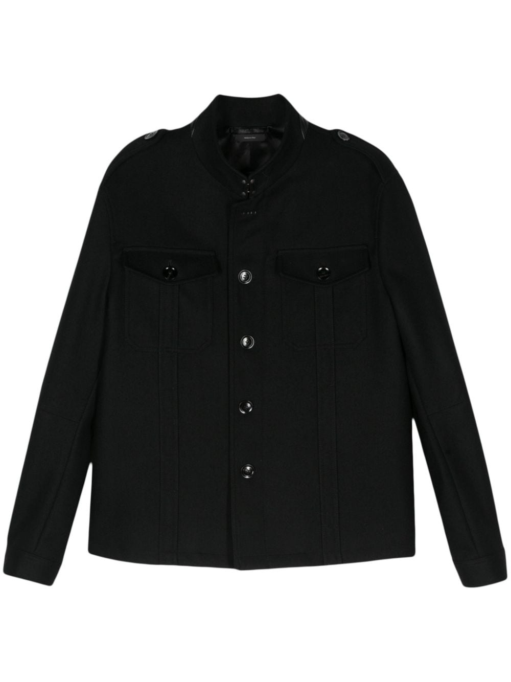 felted stand-up collar jacket Highlights - Black - Wool - Hook fastening - Front button fastening - Leather trim - Band collar - Epaulettes - Two button fastening chest flap pockets - Long sleeves - Buttoned cuffs - Full lining - Straight hem Made in Italy Composition Outer: Wool 100%, Bos Taurus 100% Lining: Cotton 56%, Viscose 44%