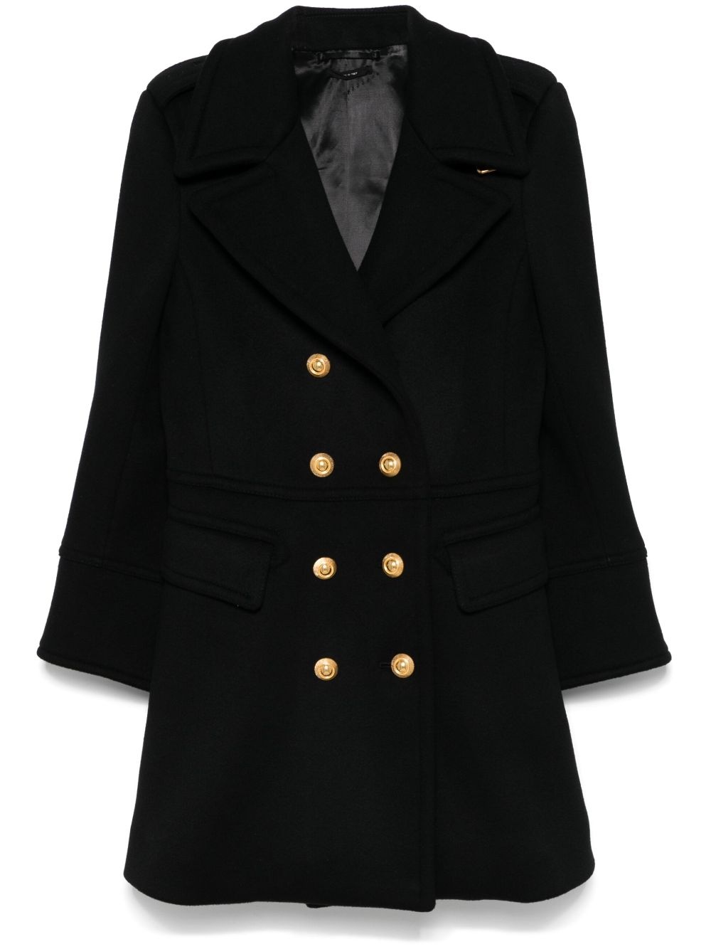 wool peacoat Highlights - Black - Virgin wool - Felted - Front buckle fastening - Double-breasted button fastening - Notched lapels - Gold-tone buttons - Epaulettes - Shoulder pads - Long sleeves - Buttoned cuffs - Two side flap pockets - Adjustable strap to the rear - Central rear vent - Full lining - Straight hem Made in Italy Composition Lining: Cotton 56%, Viscose 44% Outer: Virgin Wool 100%, Bos Taurus 100% SIZE & FIT Model measurements Height 5 ft 10 in(1.78 m) Bust/Chest 33.85 in(86 cm) Hips 36.61 in(93 cm) Waist 26.77 in(68 cm) FittingInformation Designed for a slim fit that sits just away from the body offering a close yet comfortable fit The internal shoulder pads offer a structured shape Made from a midweight non-stretch fabric