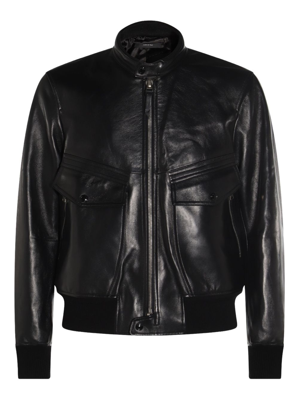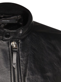 zip-front leather jacket Highlights - Black - Leather - Zip fastening - Multiple pockets - Ribbed hem - Band collar Made in Italy Composition Leather 100% Washing instructions Read Manufacturer Guidelines