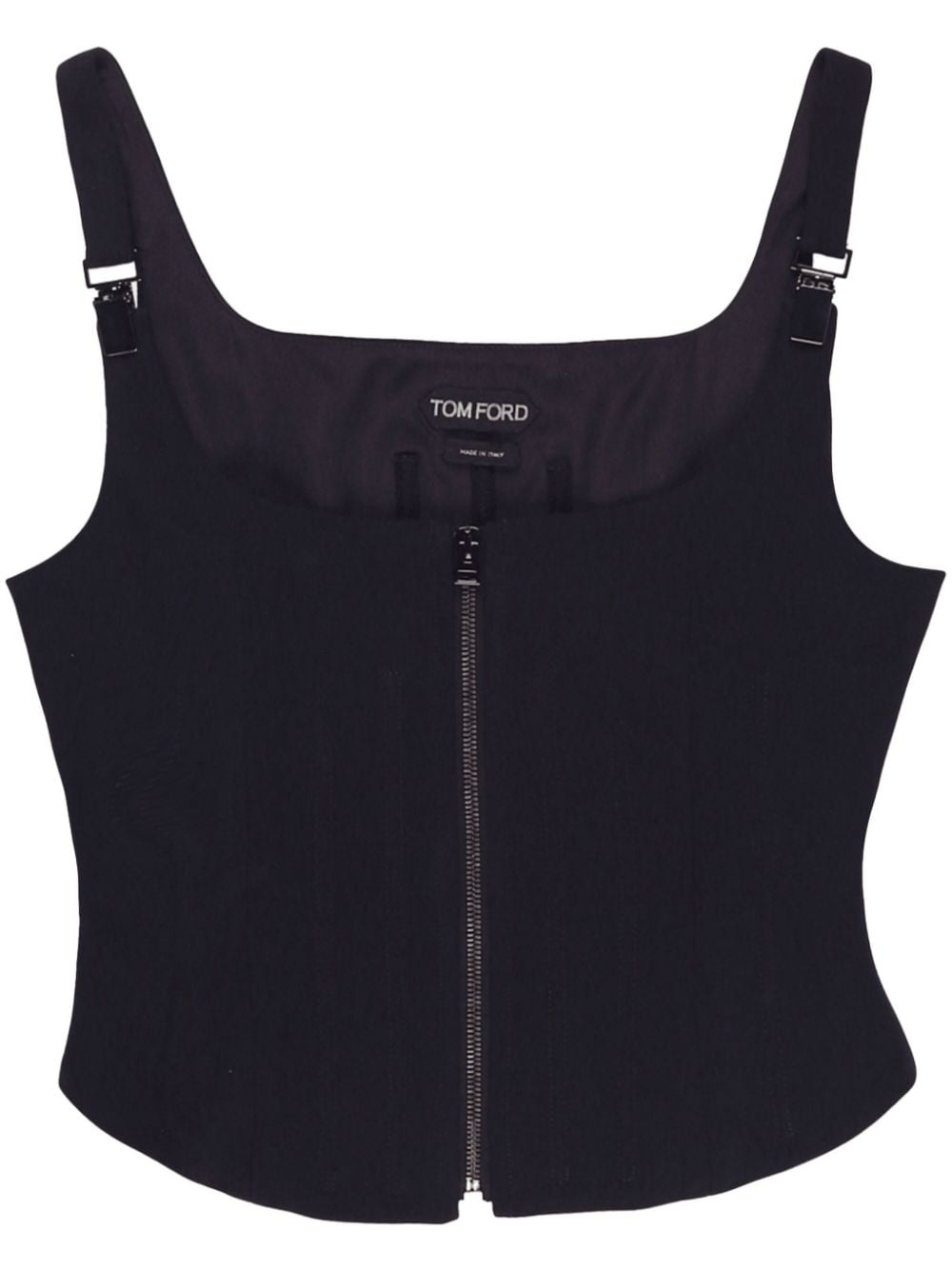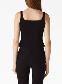 zip-up corset tank top Highlights - Black - Cady texture - Corset style - Boned bodice - Square neck - Square open back - Front zip fastening - Clip fastening - Sleeveless - Curved hem Made in Italy Composition Viscose 97%, Elastane 3%