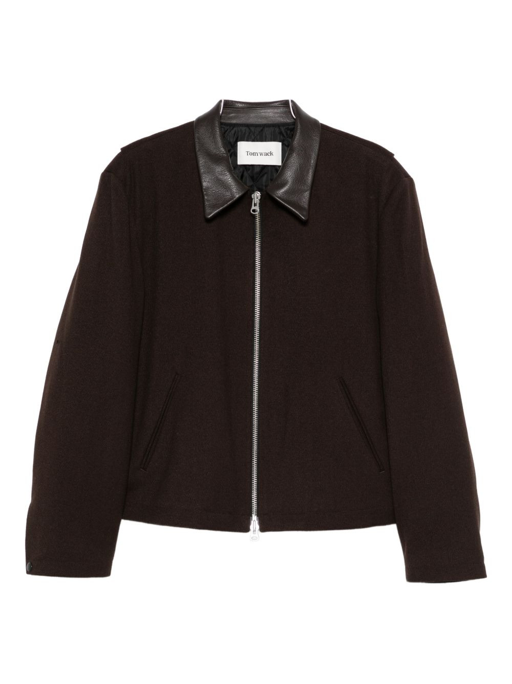 leather-collared zip-front jacket Highlights - Dark brown - Leather collar - Front zip fastening - Side welt pockets - Long sleeves - Buttoned cuffs Imported Composition Virgin Wool 100% Washing instructions Read Manufacturer Guidelines