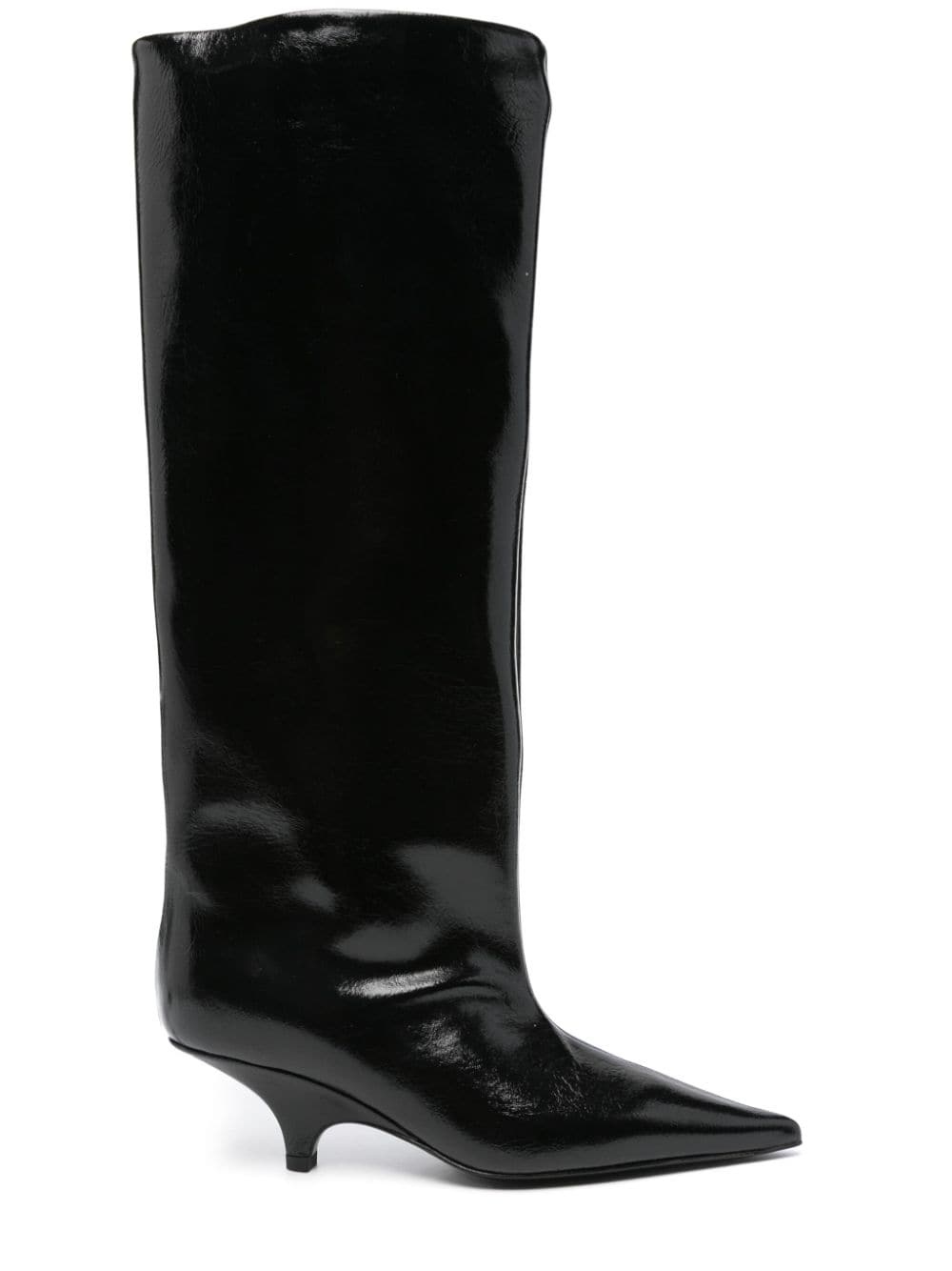 55mm The Wedge-Heel boots Highlights - Black - Calf leather - Patent finish - Crinkled finish - Slip-on style - 55mm low wedge heel - Pointed toe - Branded leather insole - Knee-length - Leather outsole - This piece comes complete with a protective dust bag. Made in Italy Composition Outer: Calf Leather 100% Lining: Sheepskin 100% Sole: Calf Leather 100% SIZE & FIT Measurement HEEL 2.36 in(6 cm)